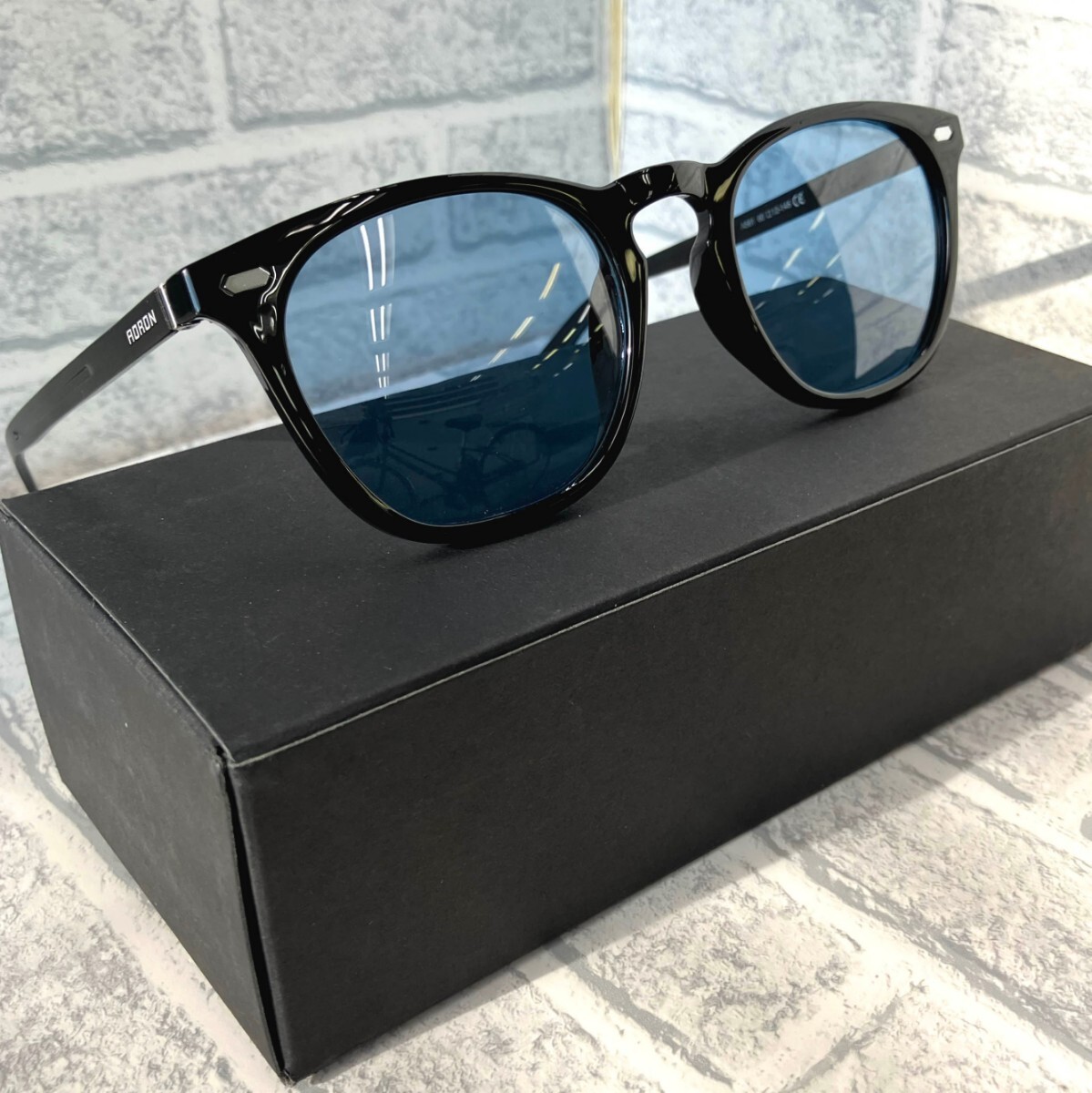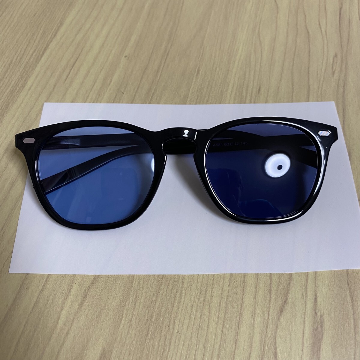 フレームはブラックで、レンズはブルーのスモークになります。サイドのテンプルはアルミマグネシウムで軽量です。テンプルのヒンジははスプリングヒンジなので、フィット感も抜群!