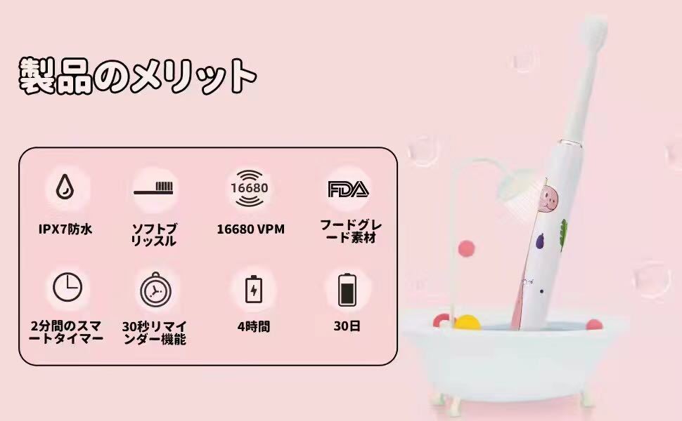 [子供向け ] 食品グレードの高い水準のやわらかい極細毛ブラシを厳選して、子供のために特別に設計された電動歯ブラシです。人間工学に基づいた子供にも握りやすく滑り止めハンドル設計、IPX7級防水設計でお風呂中でも使用可能と歯磨きを楽しめます。
