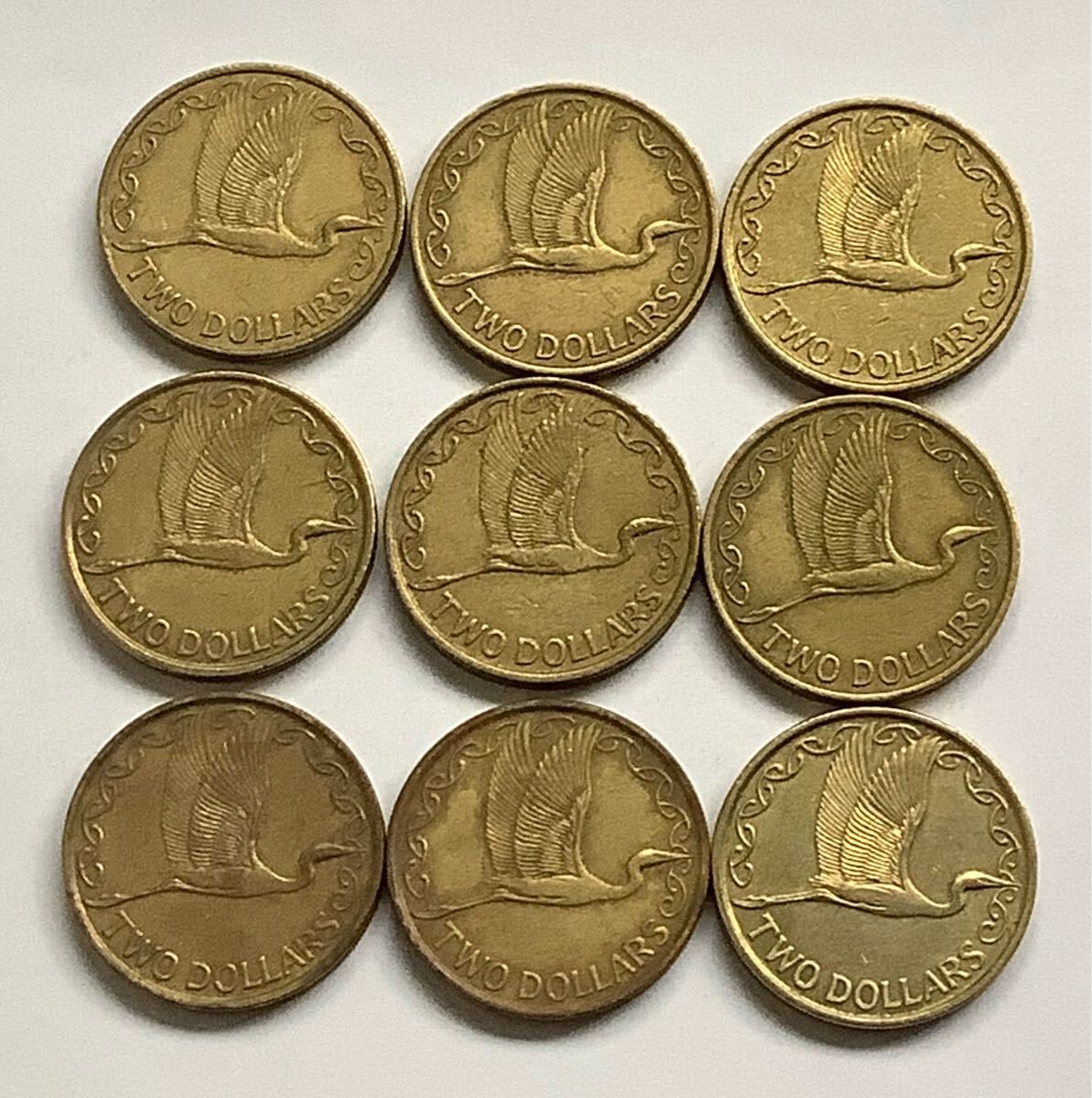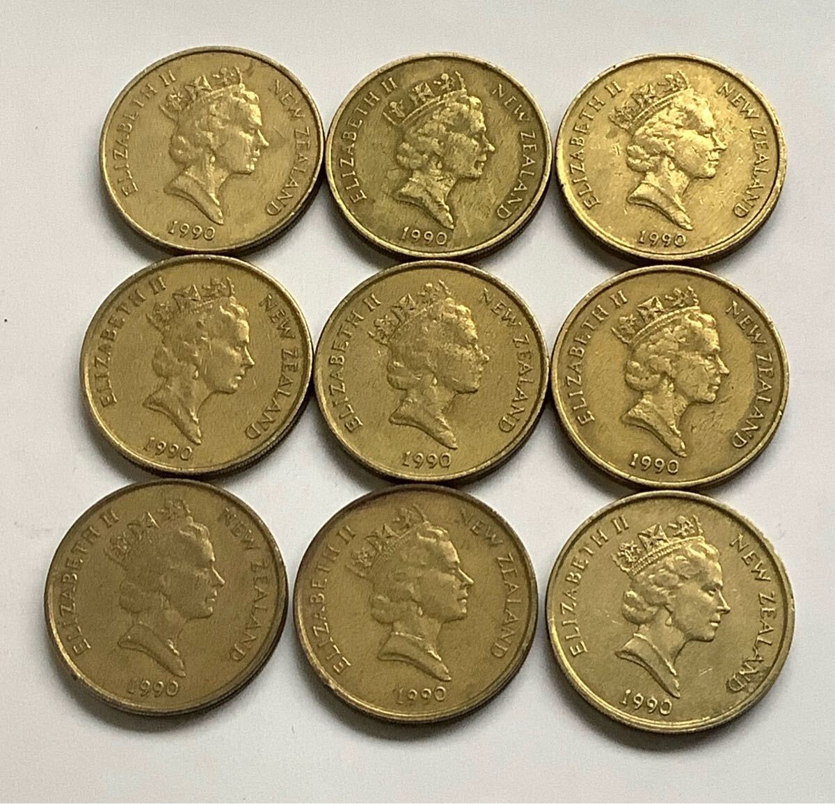 【商品詳細】ニュージーランド エリザベス女王肖像デザイン 2ドル硬貨 1990年 9枚