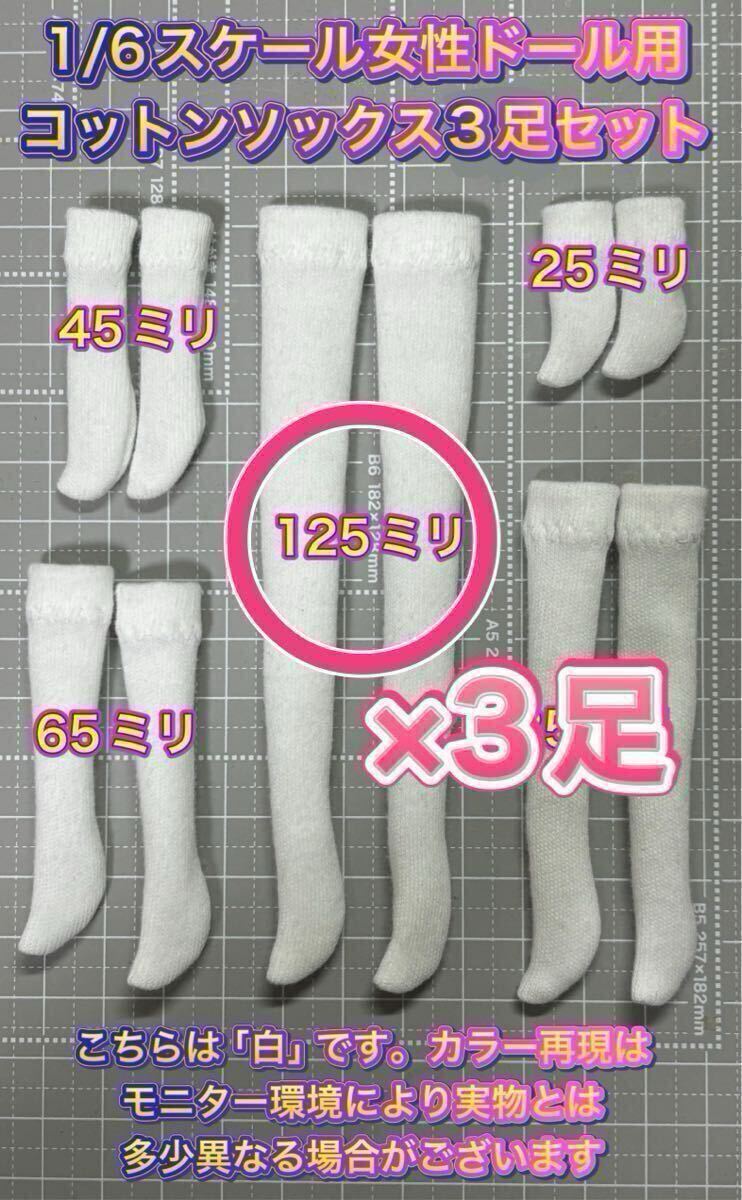 リカちゃん、ジェニー、ネオブライス、アイシードール 、オビツ27女性ボディ、ハッシュタグボディなどが着用出来る、ごくシンプルな綿のソックス長さ違い、平置きで約125ミリの3足セットです。