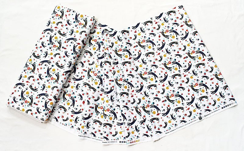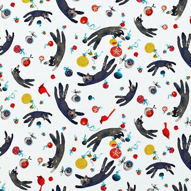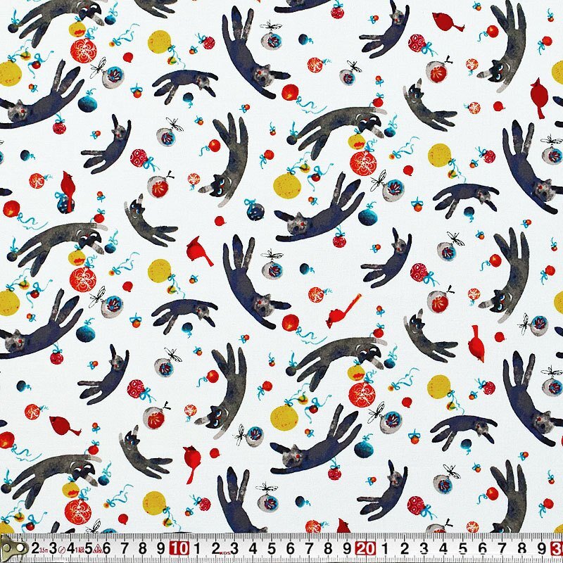 クロネコとクリスマス・オーナメントとカーディナルを生地全体に散らばらせています。