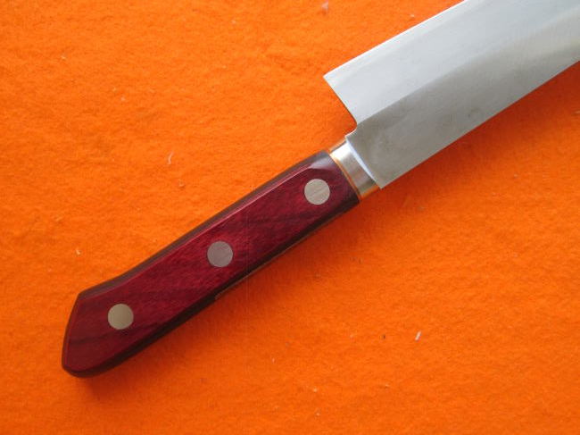 ステンレスとステンレスの間に高級鋼の青紙スーパー鋼を挟み込んだ三層構造の牛刀です。
