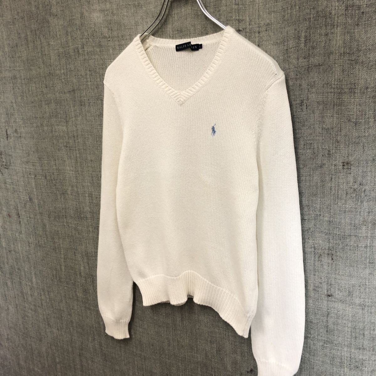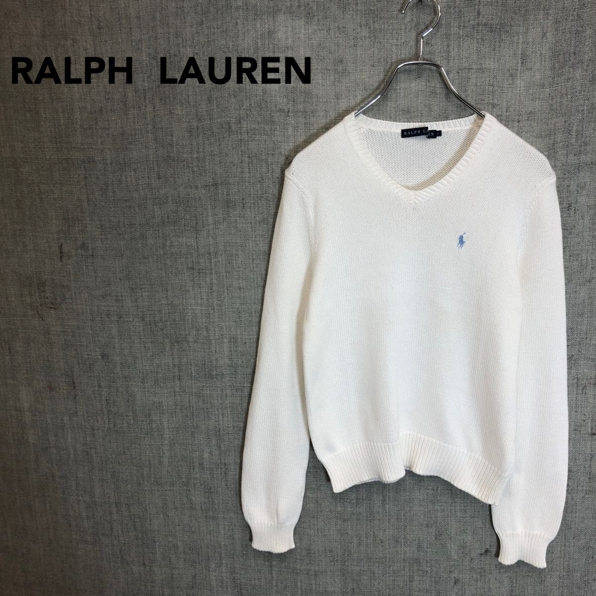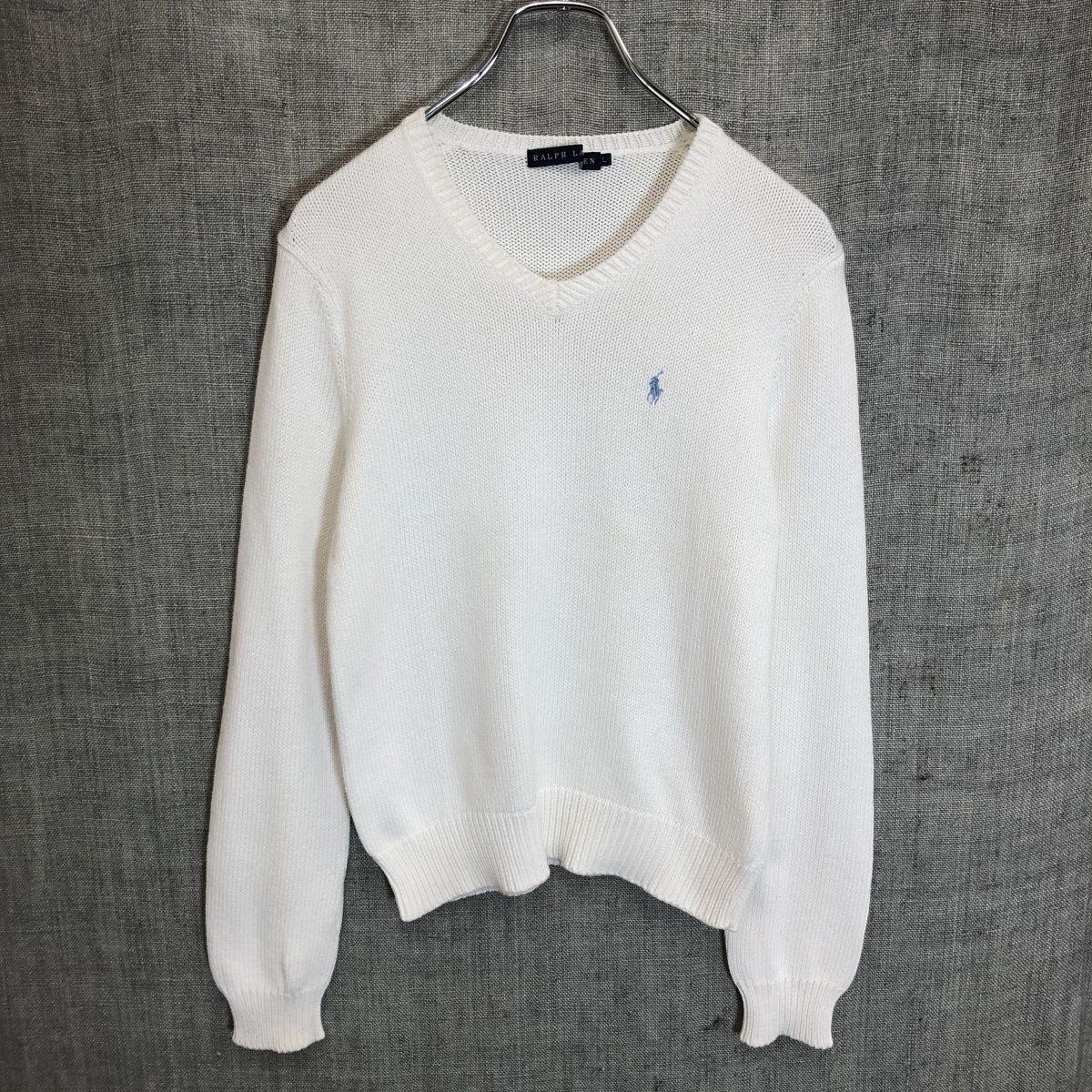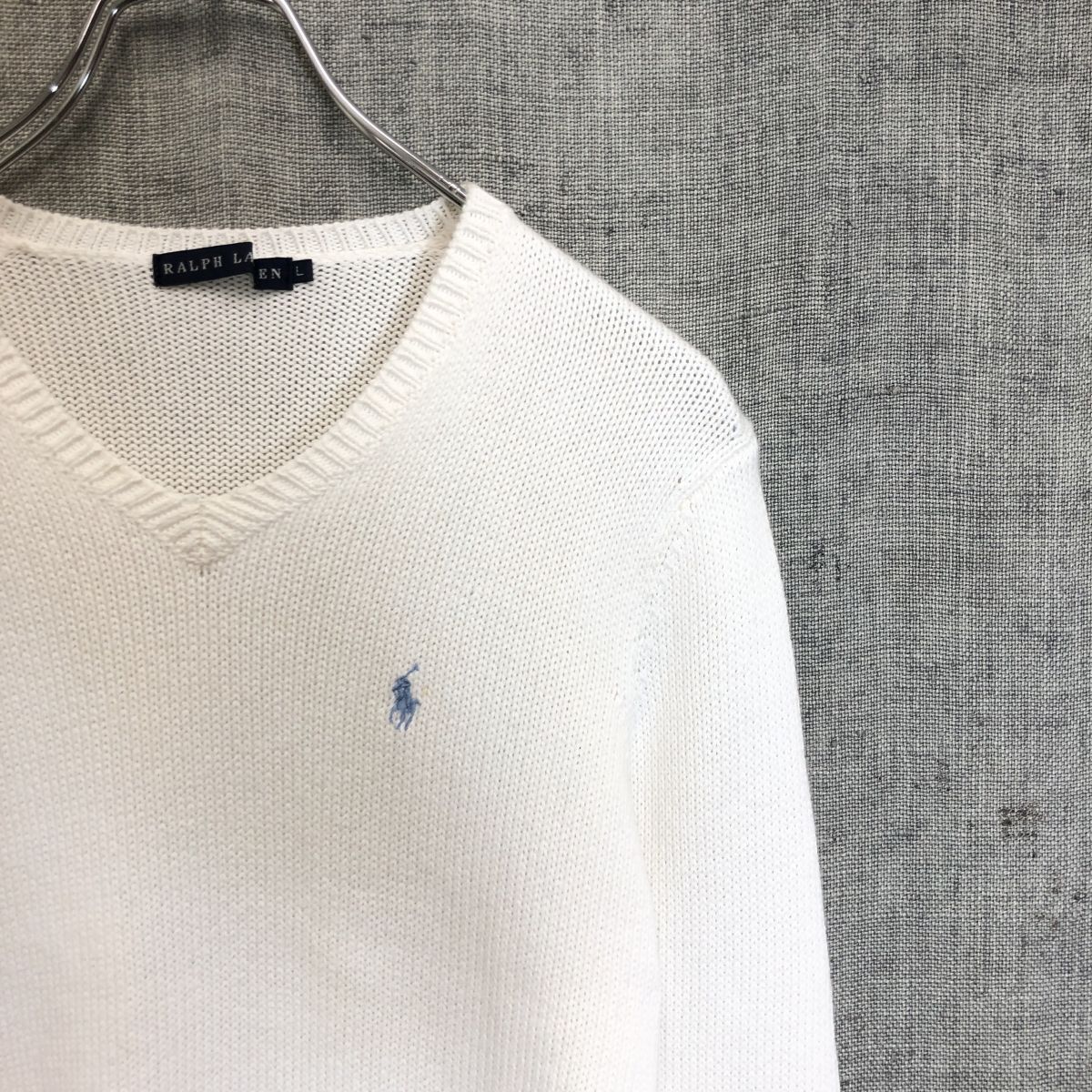 2K1664-O-N◆RALPH LAUREN ラルフローレン 長袖ニット セーター Vネック 刺繍ロゴ ワンポイント ◆sizeL ホワイト コットン