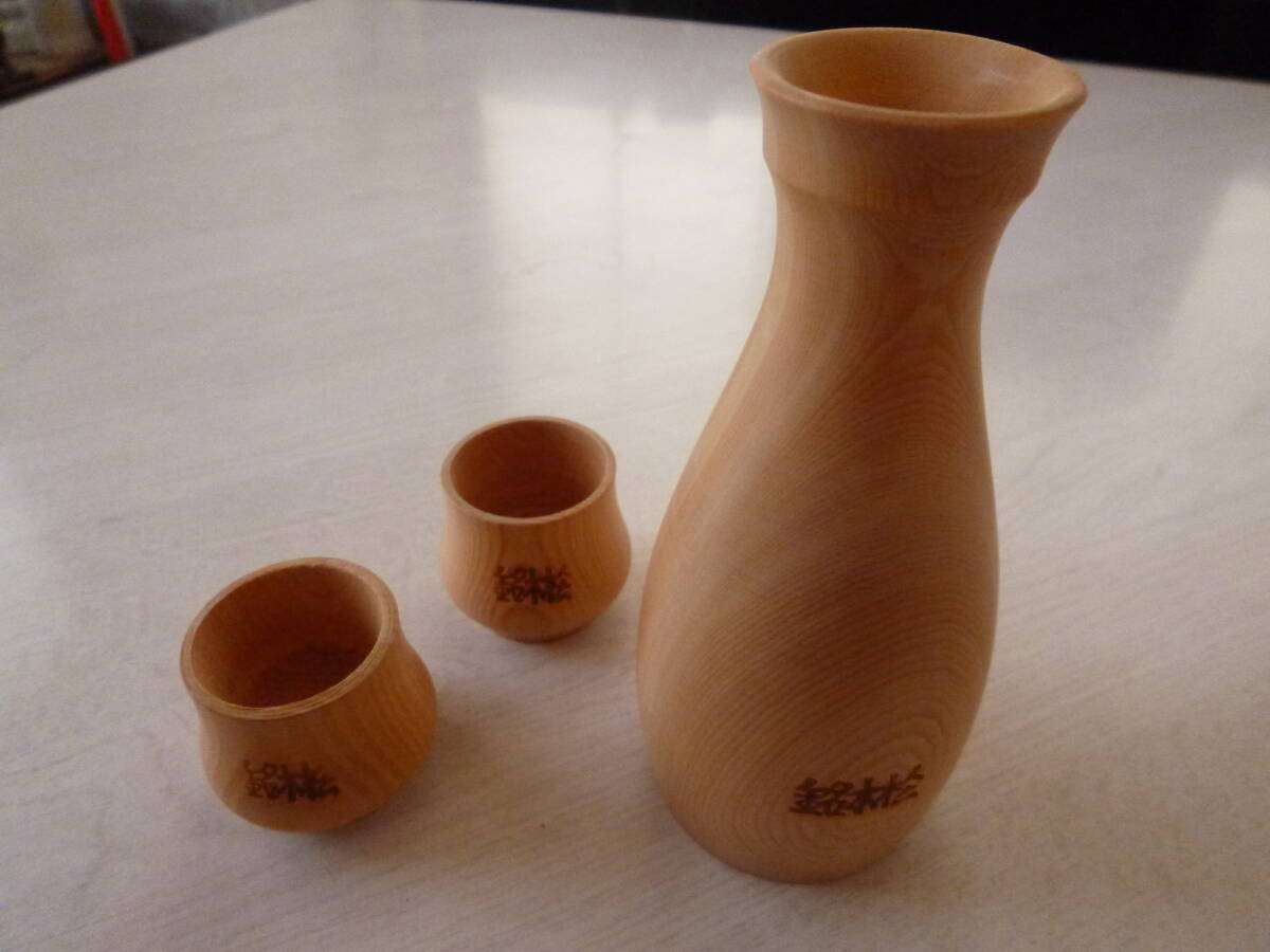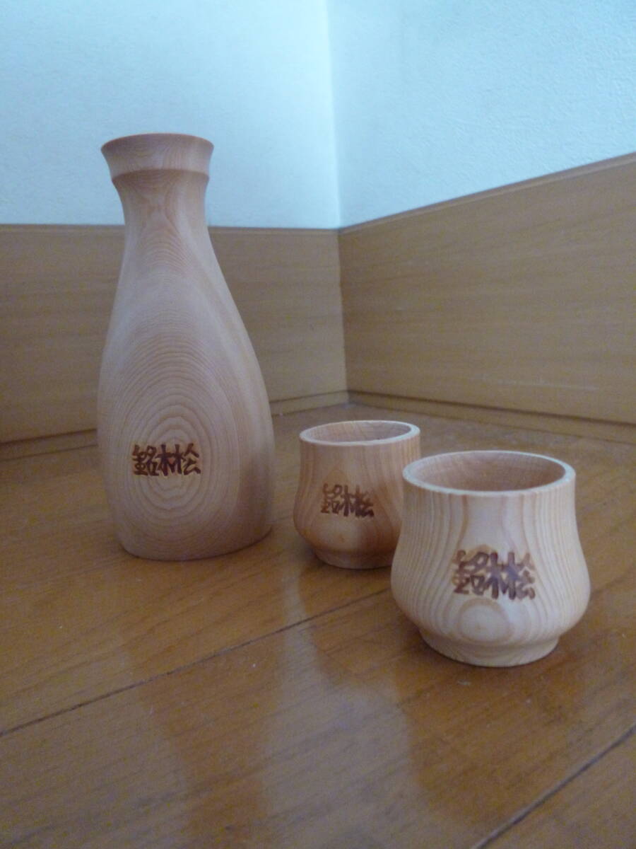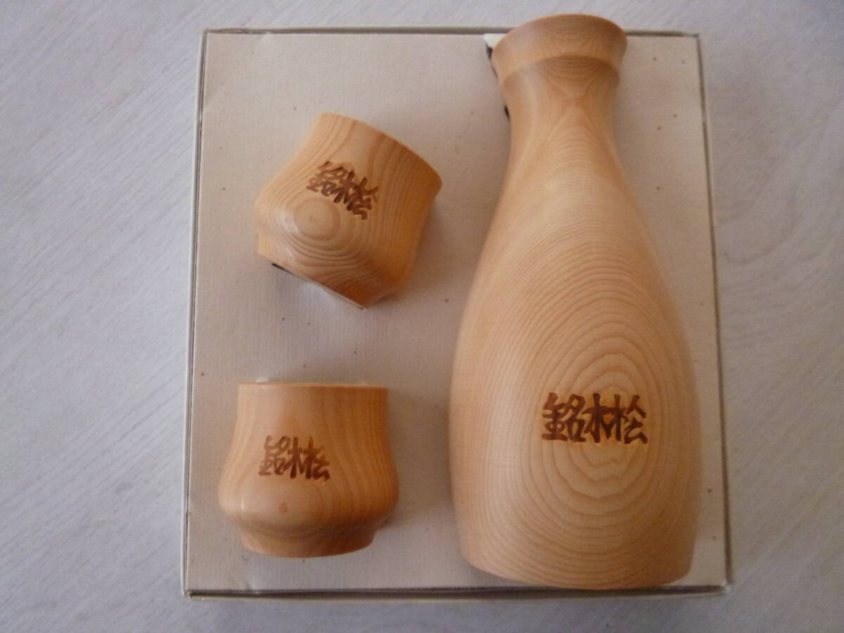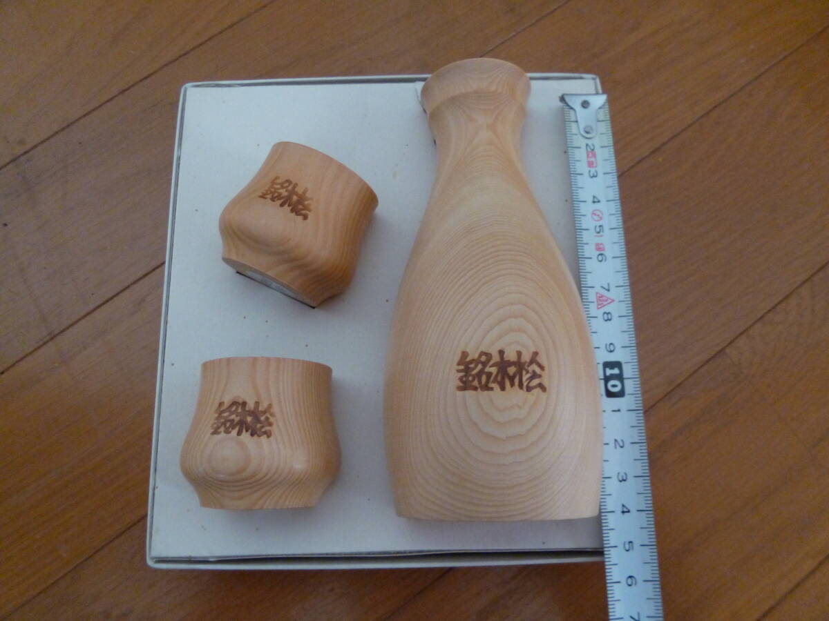 銘木 天然ヒノキ材を使用した未使用の徳利&お猪口2個のセット(箱入)です。