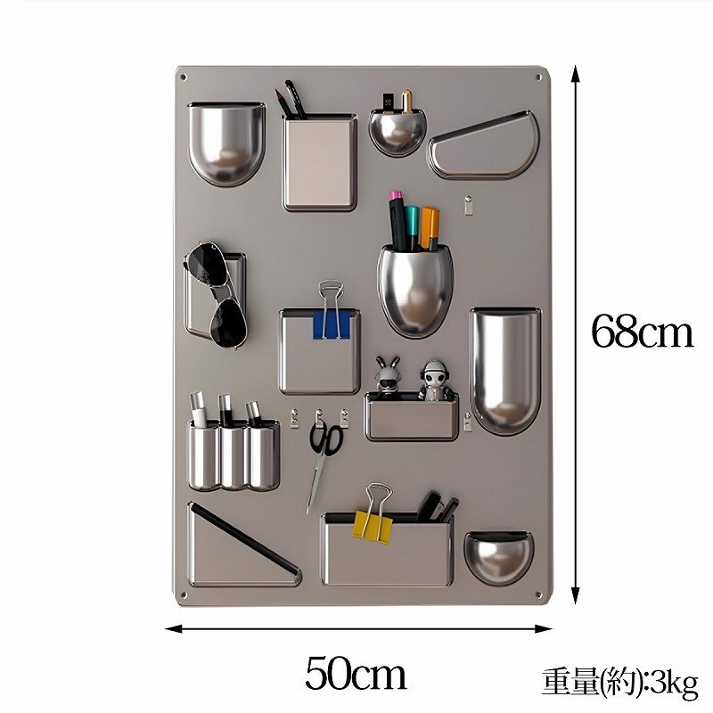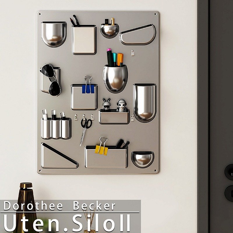 ![]() ミッドセンチュリーの名作 「美しく、見せる」収納ラック ミッドセンチュリーの家具を語るときに、欠かせない存在である壁掛けラック「Uten.Silo(ウーテンシロ)」。 照明デザインの巨匠、Ingo Mauer(インゴ・マウラー)と、 その妻であるDorothee Becker(ドロシー・ベッカー)による作品です。 1969年に発表されて以来、その緻密にデザインされた美しさと 機能性の高さから世界中で長く愛され続ける名作です。 ウーテンシロにはこれ一つに金属のフックや様々な形のポケットがあるため、 日常的に使うあらゆるものを探しやすく、また美しく収納出来る事で、 流行の「見せる収納」としてインテリアにアクセント与えてくれます。 ペンやはさみといったステーショナリーを入れたり、キッチン用品を入れるなど、 アイディア次第で様々な使い方が可能です。 オフィスからリビング、キッチン、書斎等、シーンや場所を選ばず幅広くお使い頂けます。 材質は水や衝撃、キズに強いABS樹脂製で木製や金属の様に腐敗やサビつきの心配が無く、 長い期間劣化せずにお使い頂けます。 サイズ(約):縦68cm、横50cm、奥行1cm カラー:シルバー デザイナー:Ingo Maurer&Dorothee Becker(インゴ・マウラー&ドロシー・ベッカー) 素材:ABS/ニッケルメッキ仕上げ 重量(約):3kg ※工具類は付属しておりません。 |