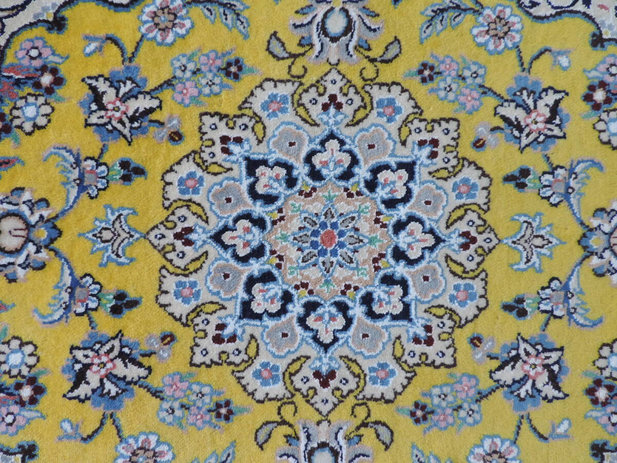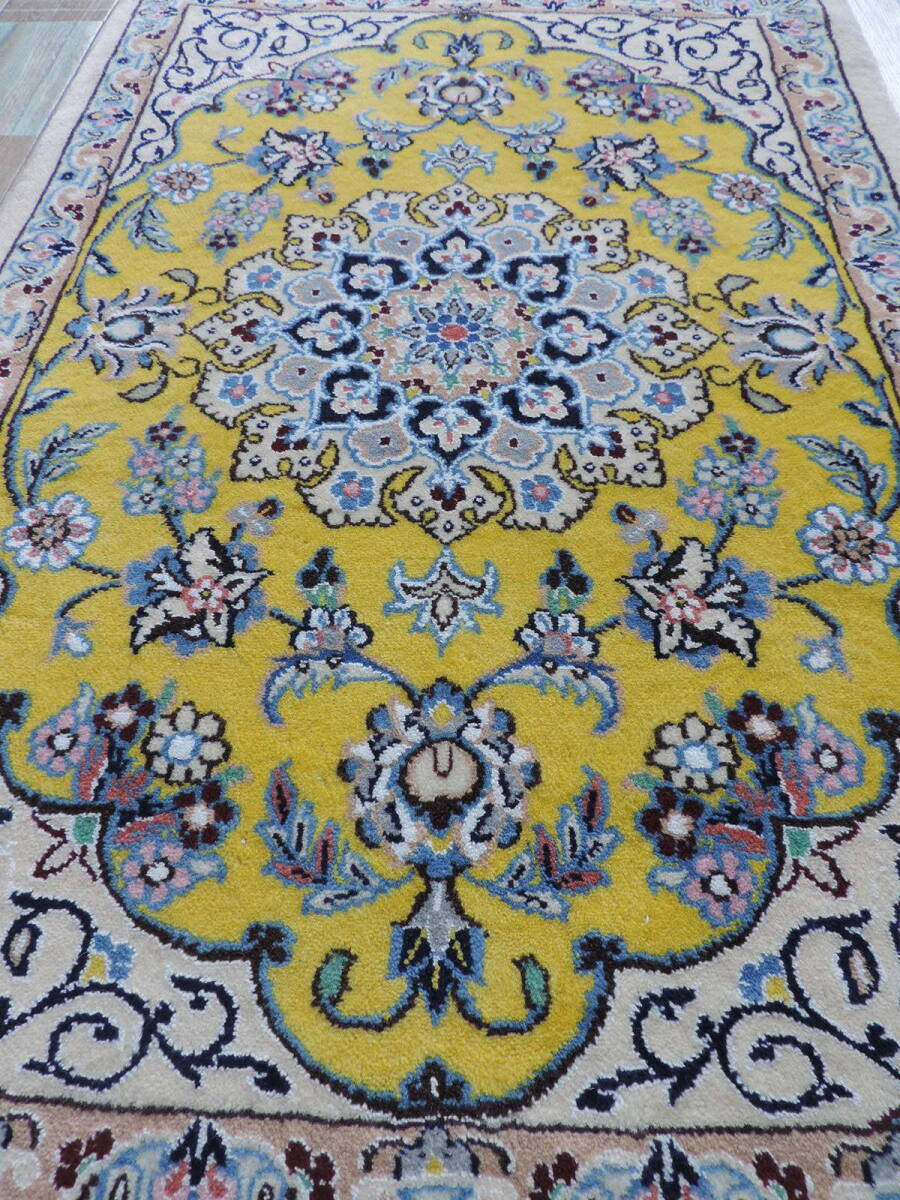 ナイン(Nain)産のペルシャ絨毯は世界的に非常に有名で、高品質なペルシャ絨毯の代表的な産地の一つです。 ナインはイラン中央部、イスファハンの東に位置する都市です。 絨毯作りにおいては比較的新しい産地(20世紀初頭から)ですが、イスファハンなどの影響を受けつつ、 独自の洗練されたスタイルを確立し、高い評価を得ています。 ナイン産ペルシャ絨毯の主な特徴: デザイン: 中央にメダリオン、四隅にラチャック・トランジ(コーナーデザイン)を配した、左右対称のデザインが非常に多いです。 シャー・アッバース文様と呼ばれる、花や葉、蔓などが精緻に絡み合った優雅なデザインが特徴的です。 全体的に非常に緻密で繊細な図柄です。 色使い: 地色にはクリーム、アイボリー、ベージュなどの明るく上品な色が使われることが多いです。 差し色として、青(特にインディゴブルー)、水色、赤、緑などが効果的に用いられ、洗練された印象を与えます。 落ち着いた配色で、どんなインテリアにも合わせやすいと言われます。 素材: パイル(毛足)には高品質なウール(コルクウールと呼ばれる細く柔らかい羊毛が使われることも多い)が主に使用されます。 デザインの輪郭線やアクセントにシルクが用いられることが多く、光沢感が加わり、より一層の高級感と繊細さを演出します。 品質と評価: その美しさと品質の高さから、世界中の愛好家やコレクターに高く評価されています。 耐久性にも優れており、適切なお手入れをすれば長く使い続けることができます。 美術品、芸術品としての価値も認められています。 |