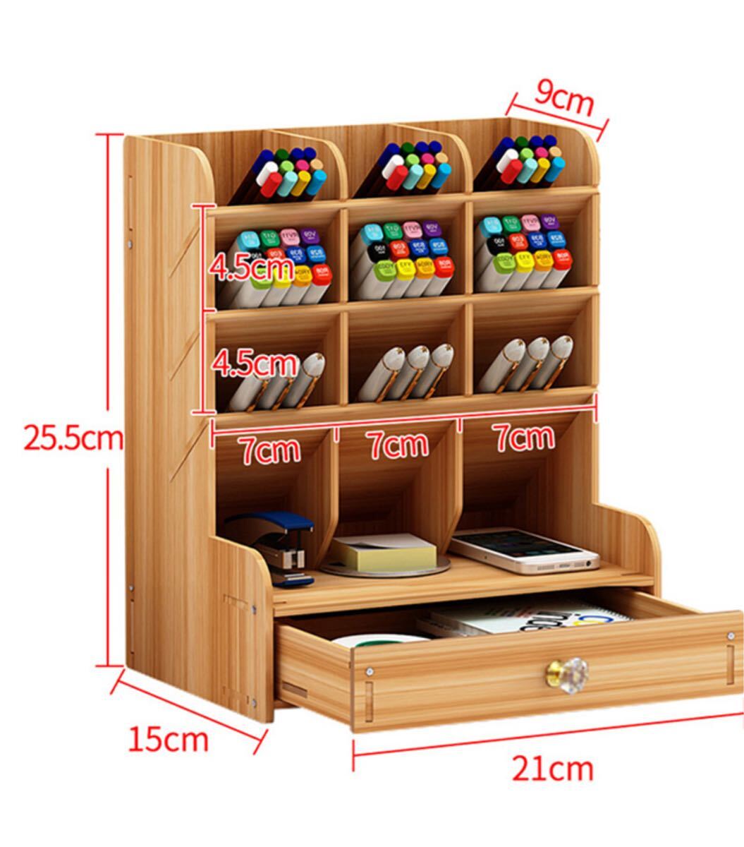 木製の組み立て式ペン立てで、12本のペンとマーカーを収納可能。引き出し付きで小物も整理できます。