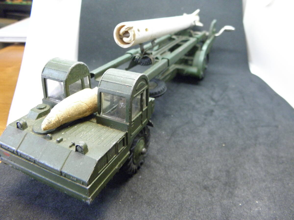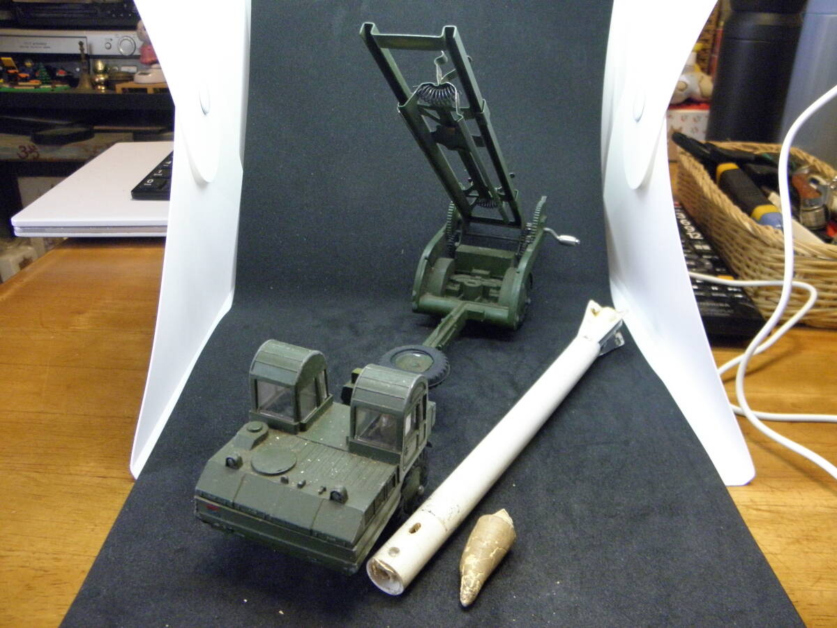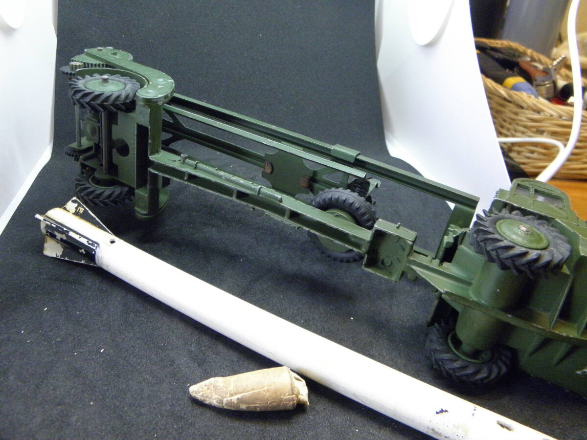 箱はありません。ミサイルの頭部分が変形して取れています。また、発射台にセットするためのロッドが欠品です。傷はそれなりですが、タイヤなどはきれいです。写真でご判断ください。
