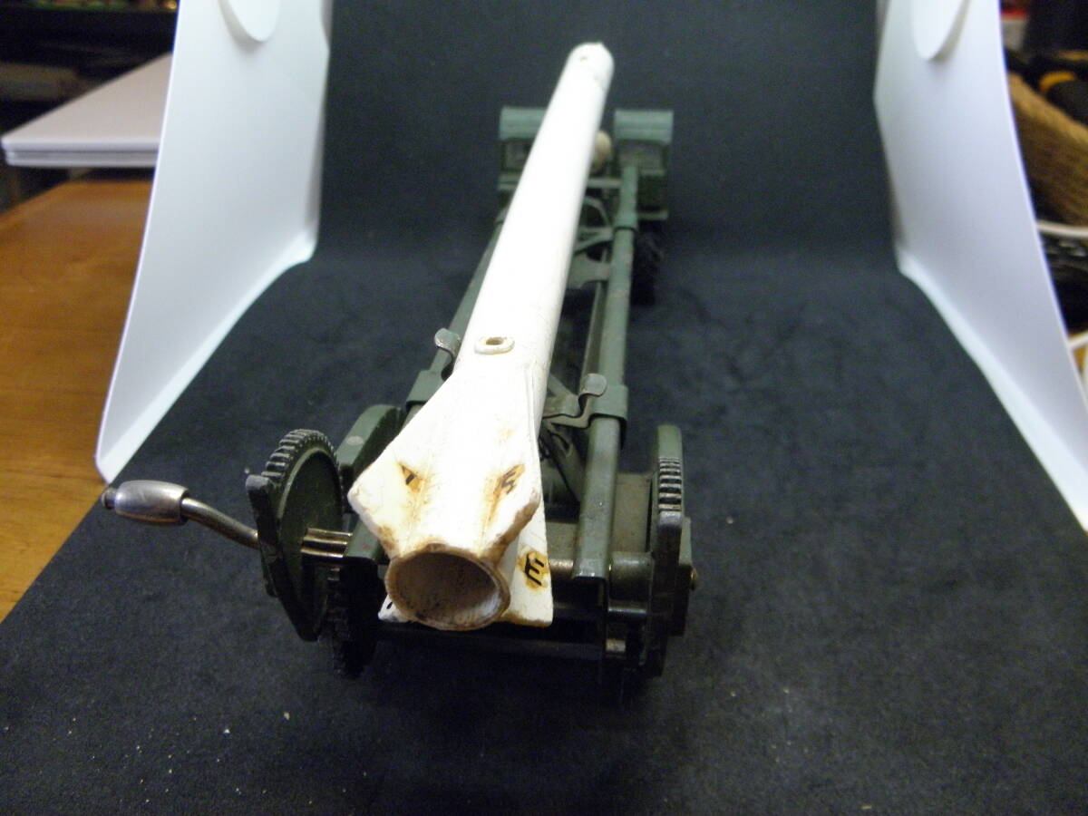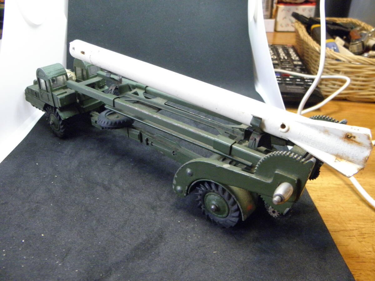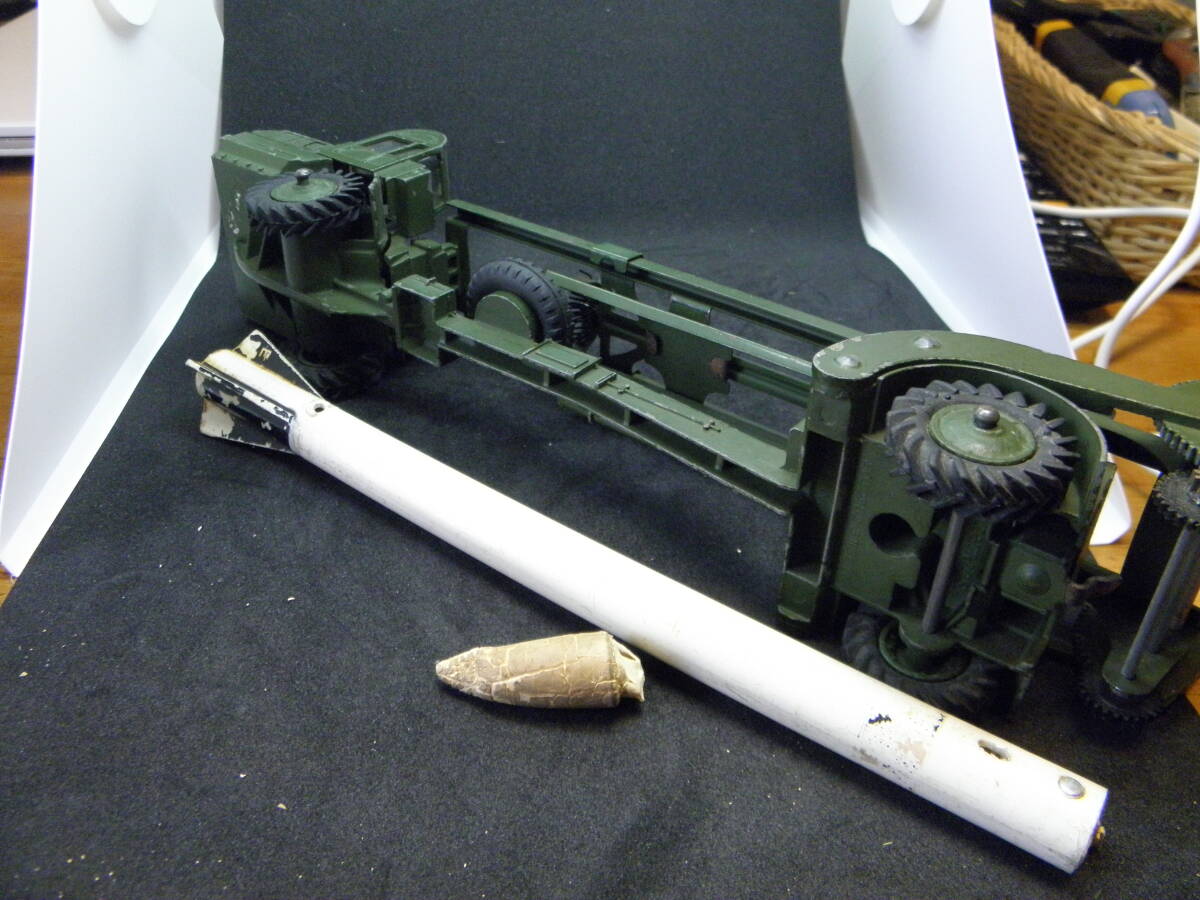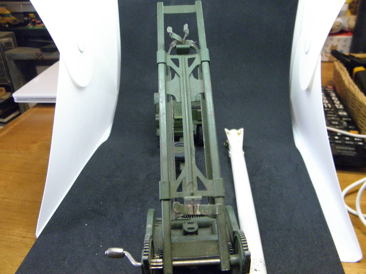 箱はありません。ミサイルの頭部分が変形して取れています。また、発射台にセットするためのロッドが欠品です。傷はそれなりですが、タイヤなどはきれいです。写真でご判断ください。