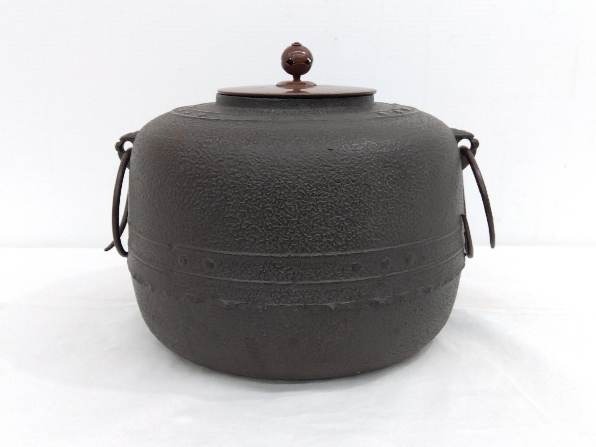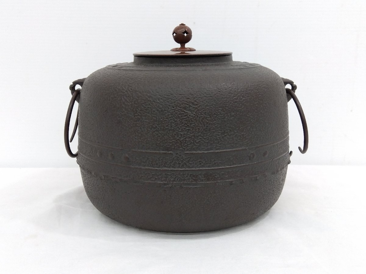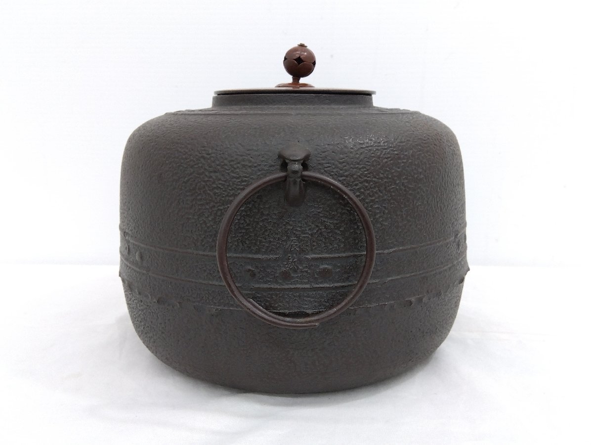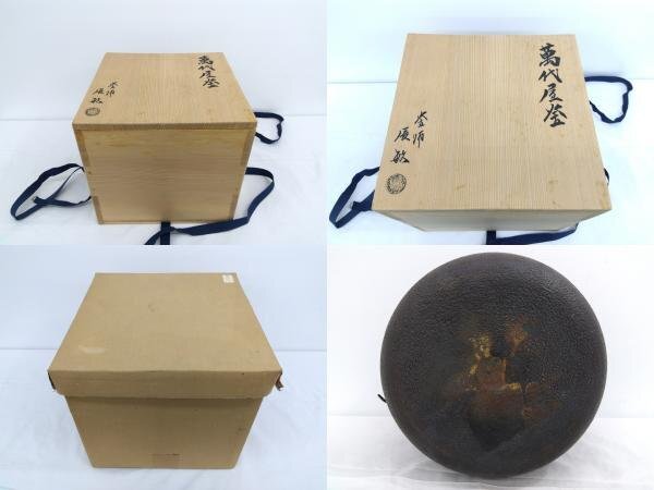 萬代屋釜 釜師 辰敏 もずやがま 中古 幅26×高さ21×奥行23cm 金属工芸 工芸品 鉄製 鉄釜 茶道具 骨董 アンティーク