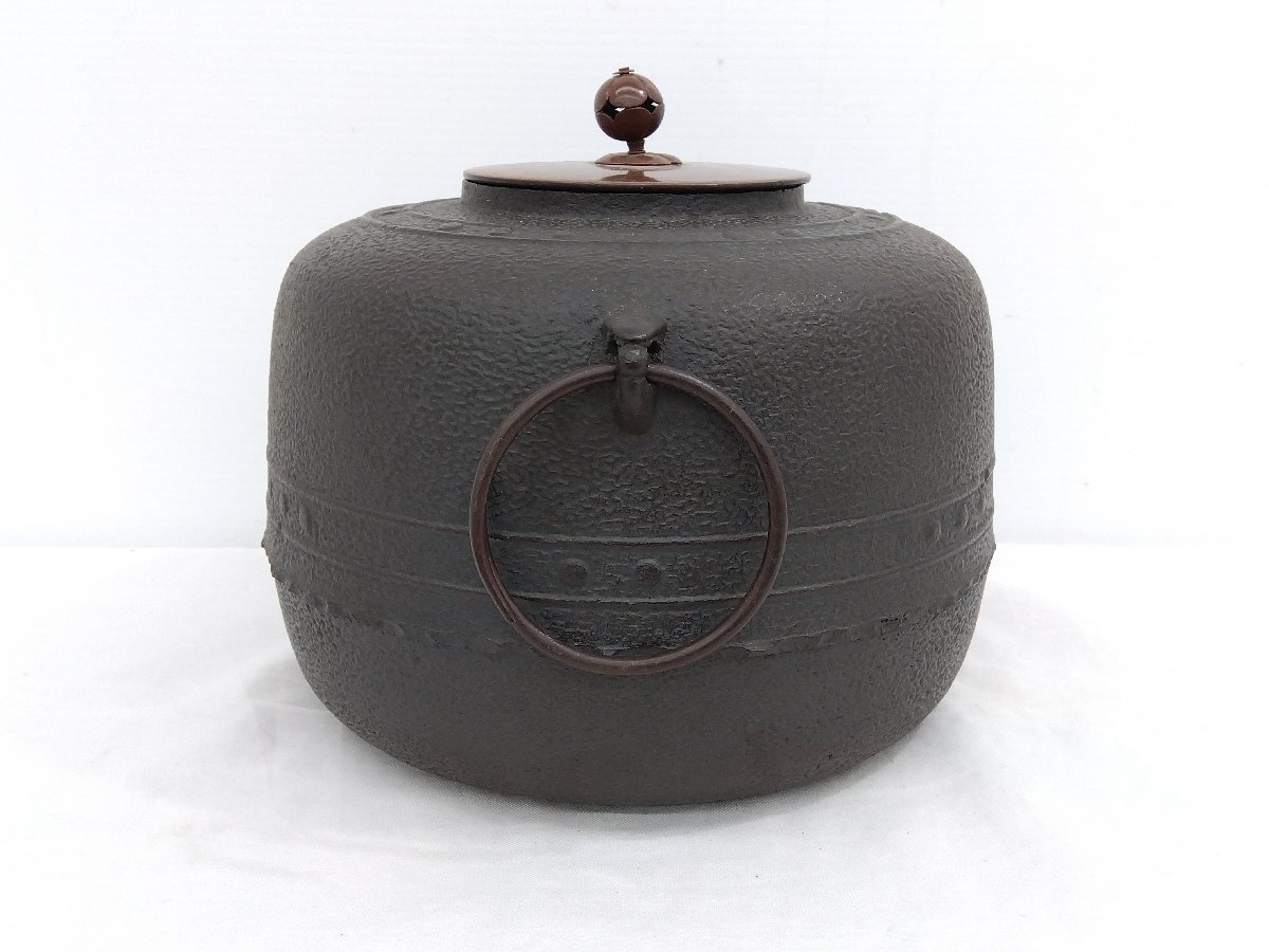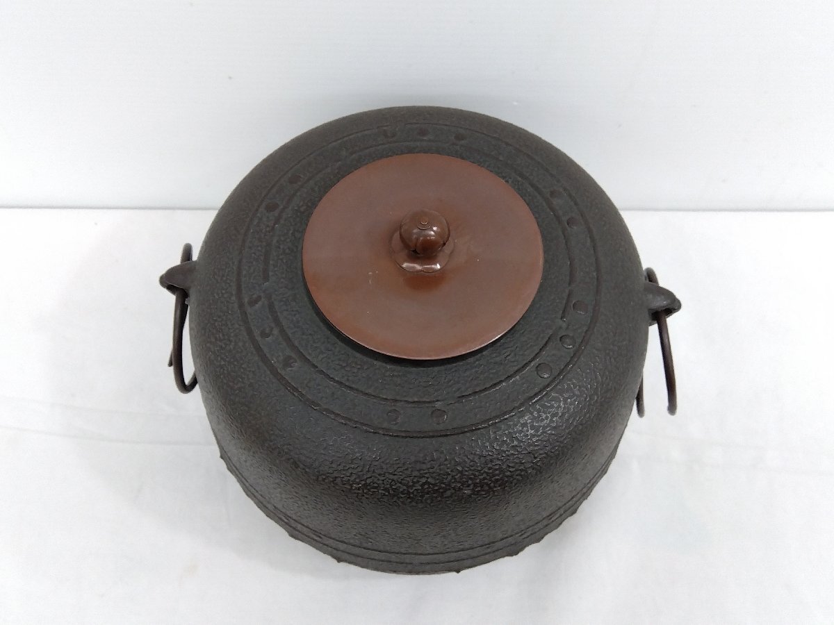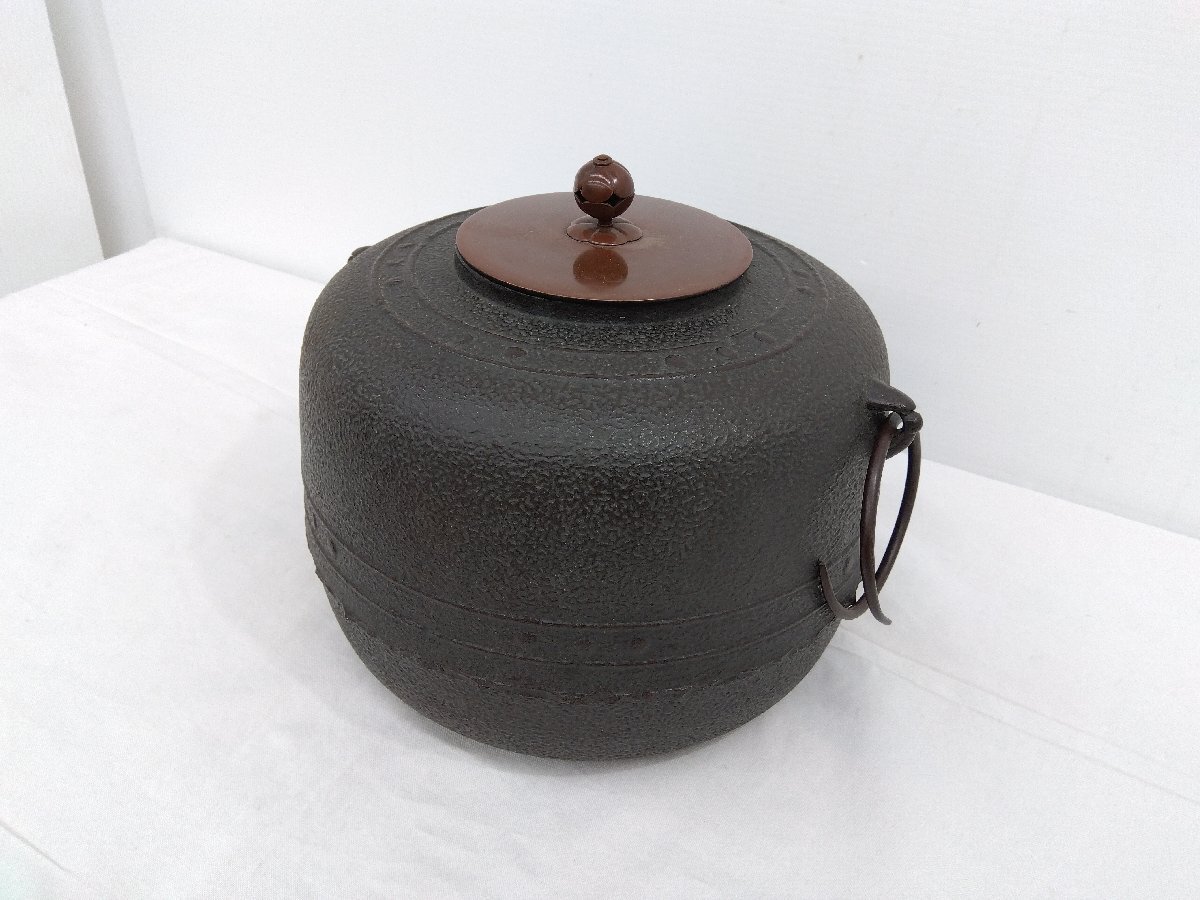 萬代屋釜 釜師 辰敏 もずやがま 中古 幅26×高さ21×奥行23cm 金属工芸 工芸品 鉄製 鉄釜 茶道具 骨董 アンティーク