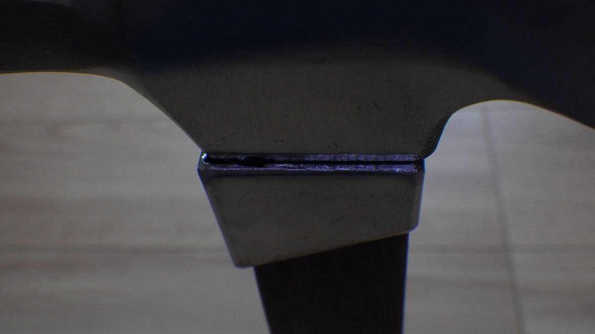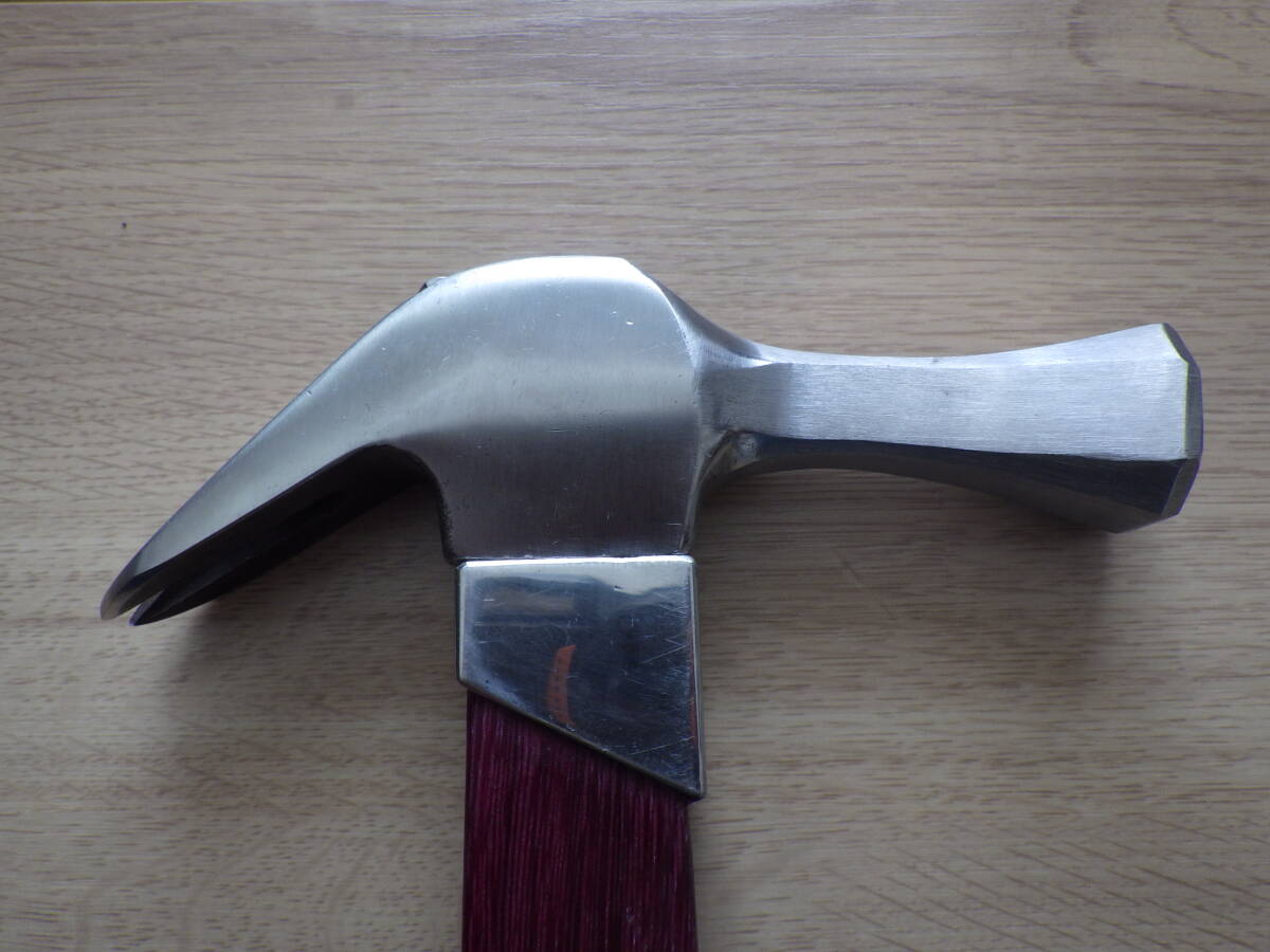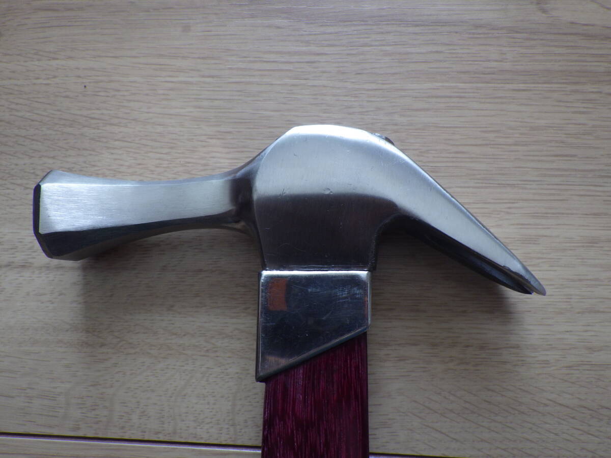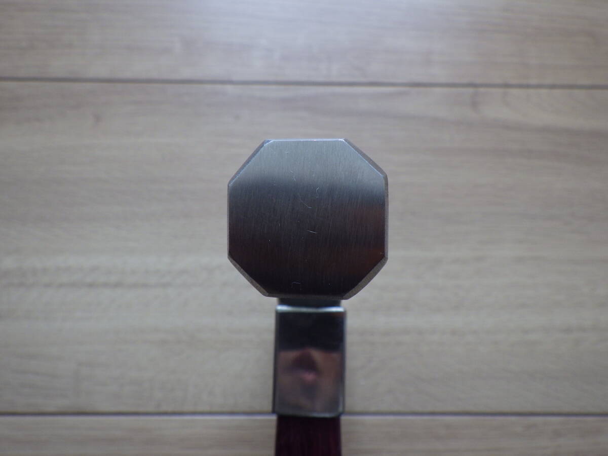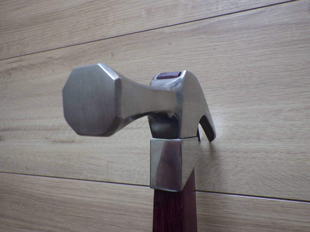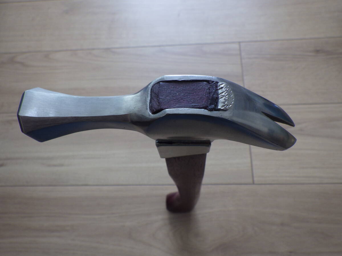 柄を保護するガードパーツ付きです。櫃穴より爪側で1.5㎝、打撃面側で2.8㎝下を保護します。素材は厚さ1.4㎜のステンレス板でパーツ自体は一体成型です。パーツの爪側より伸びる固定部を櫃穴を通して上部出口で爪状に曲げて、頭部と固定してあります。爪側から見て左側面を斜め上から見ると、頭部とガードパーツの間にわずかに隙間がありますが、がたつき等はありません。