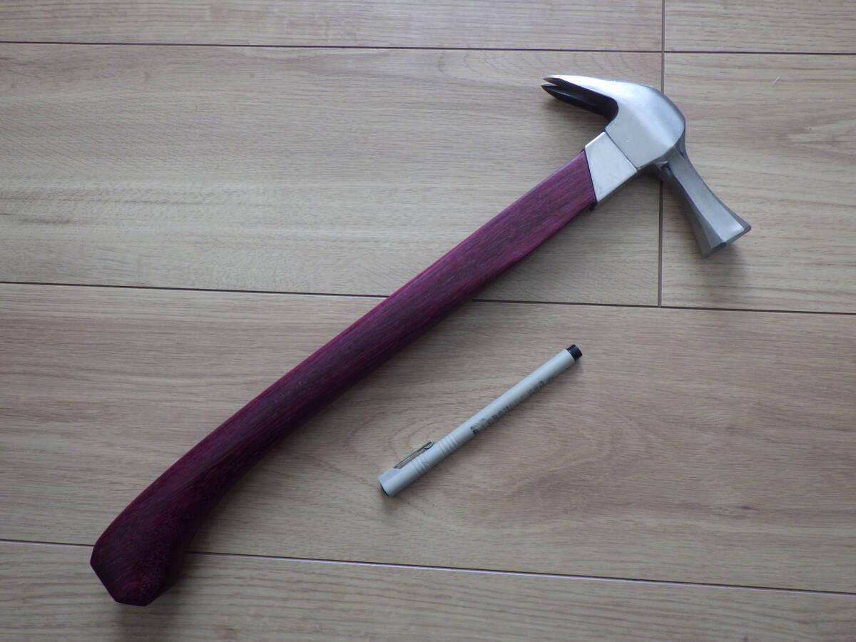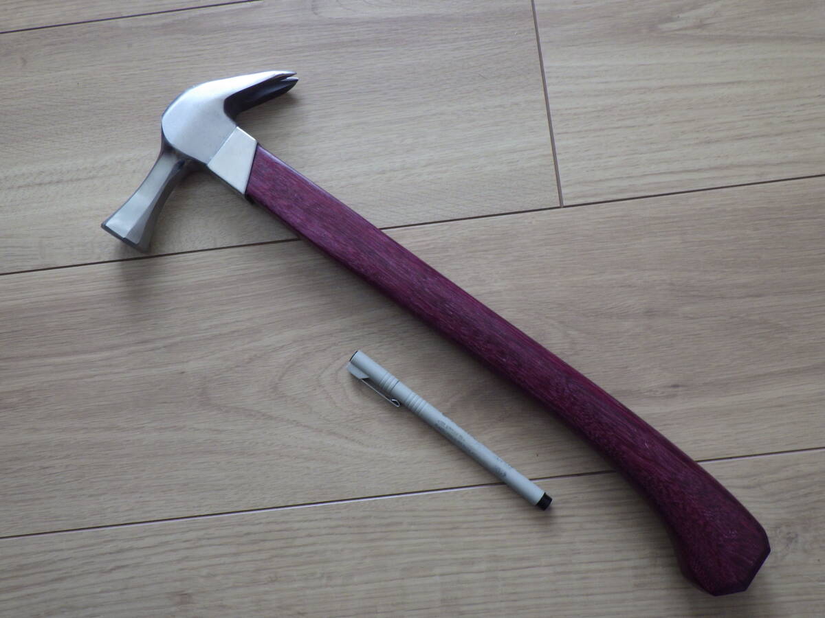未使用長期保管品 鍛造ステンレス製四角首仮枠ハンマー 頭部重量約340g。 猪の牙で磨いたパープルハートグリップ型柄付き 検玄能バール型枠