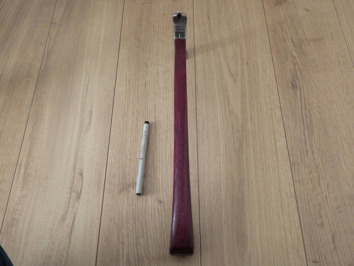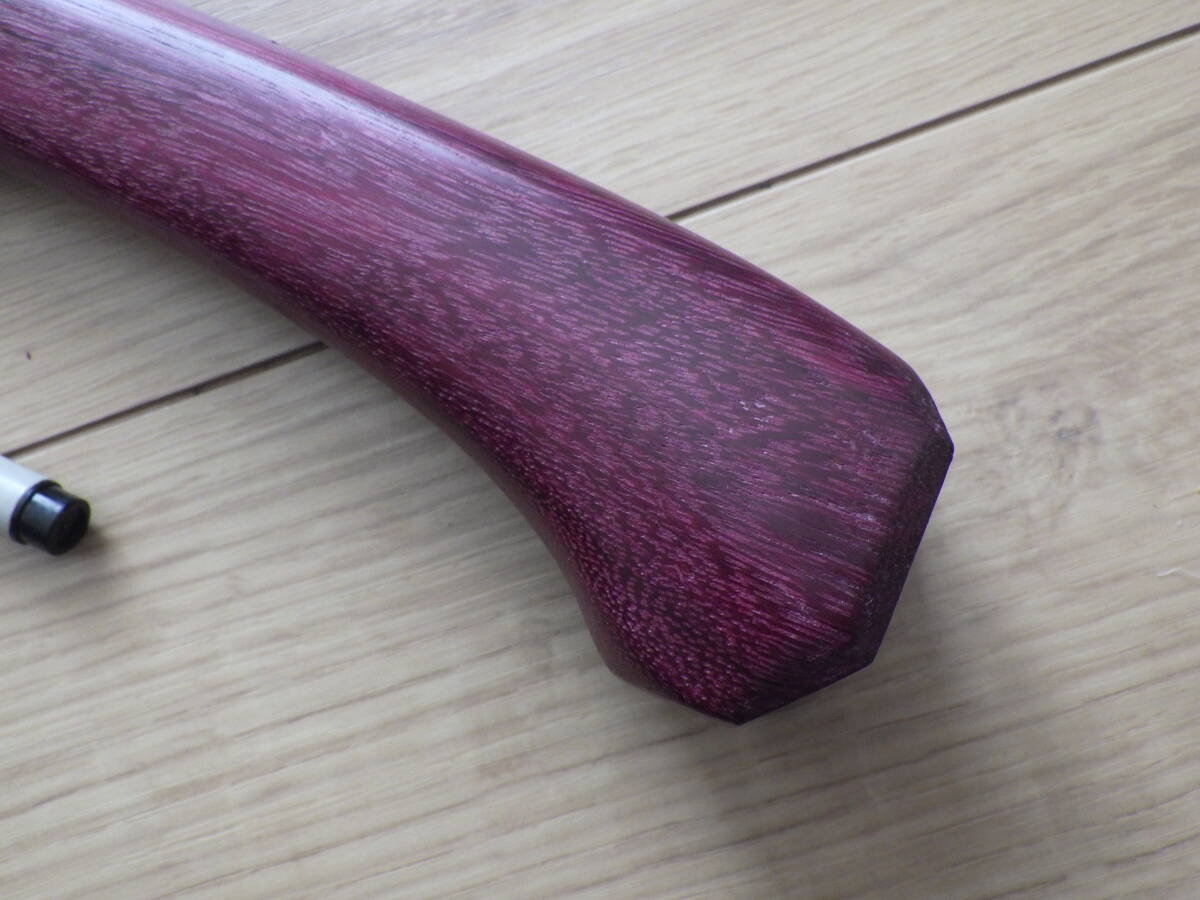 パープルハート柄は新たに製作した物です。全体の形状はほぼ直線で握り部分の断面は逆おにぎり型、柄尻をグリップ状に加工してあります。柄尻サイズ縦4.2㎝横最大3.2㎝です。柄は櫃穴一杯までパープルハート薄板で調整しながら固く仕込んでありますので楔は打っておりませんが、中古の楔を2本お付けします(写真には写っておりません。)。柄は猪の牙で磨き、オイルで仕上げてあります。これは「猪牙(いのき)がけ」と呼ばれるもので、牙のエナメル質で木材表面の導管を押しつぶしながら磨き上げることで、木材の持つ本来の色艶を引き出すことができる手法です。主に弓道の弓(和弓)を製造する際に用いられています。