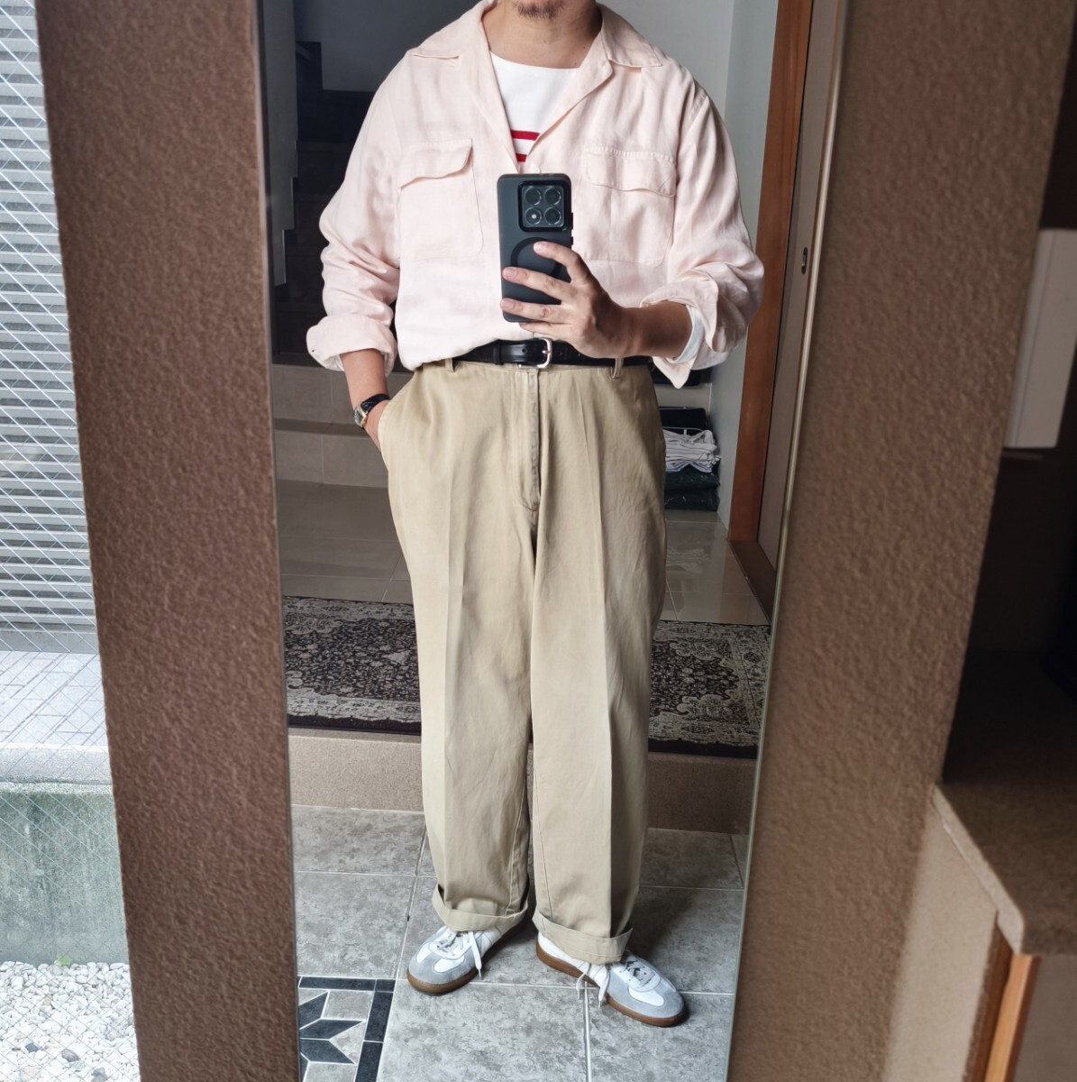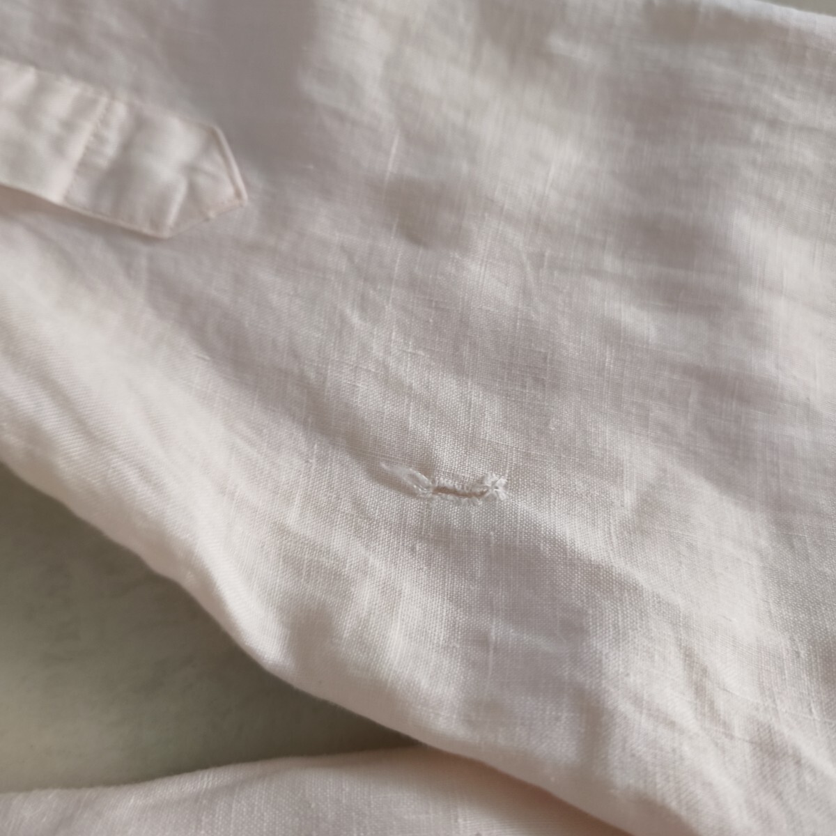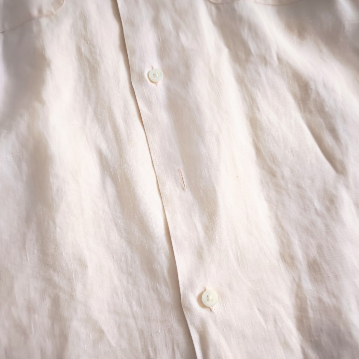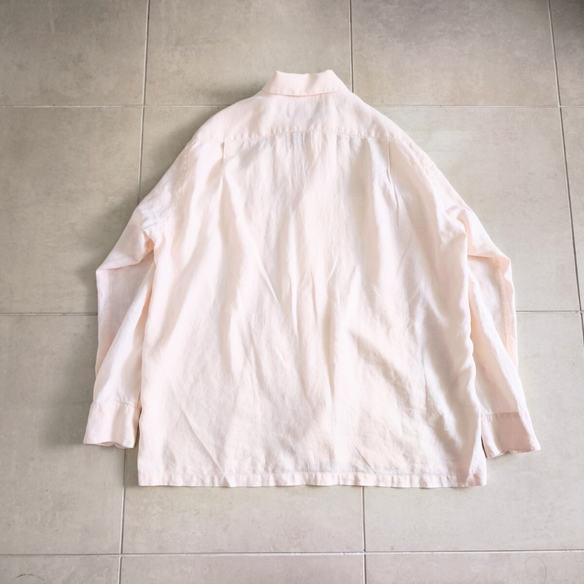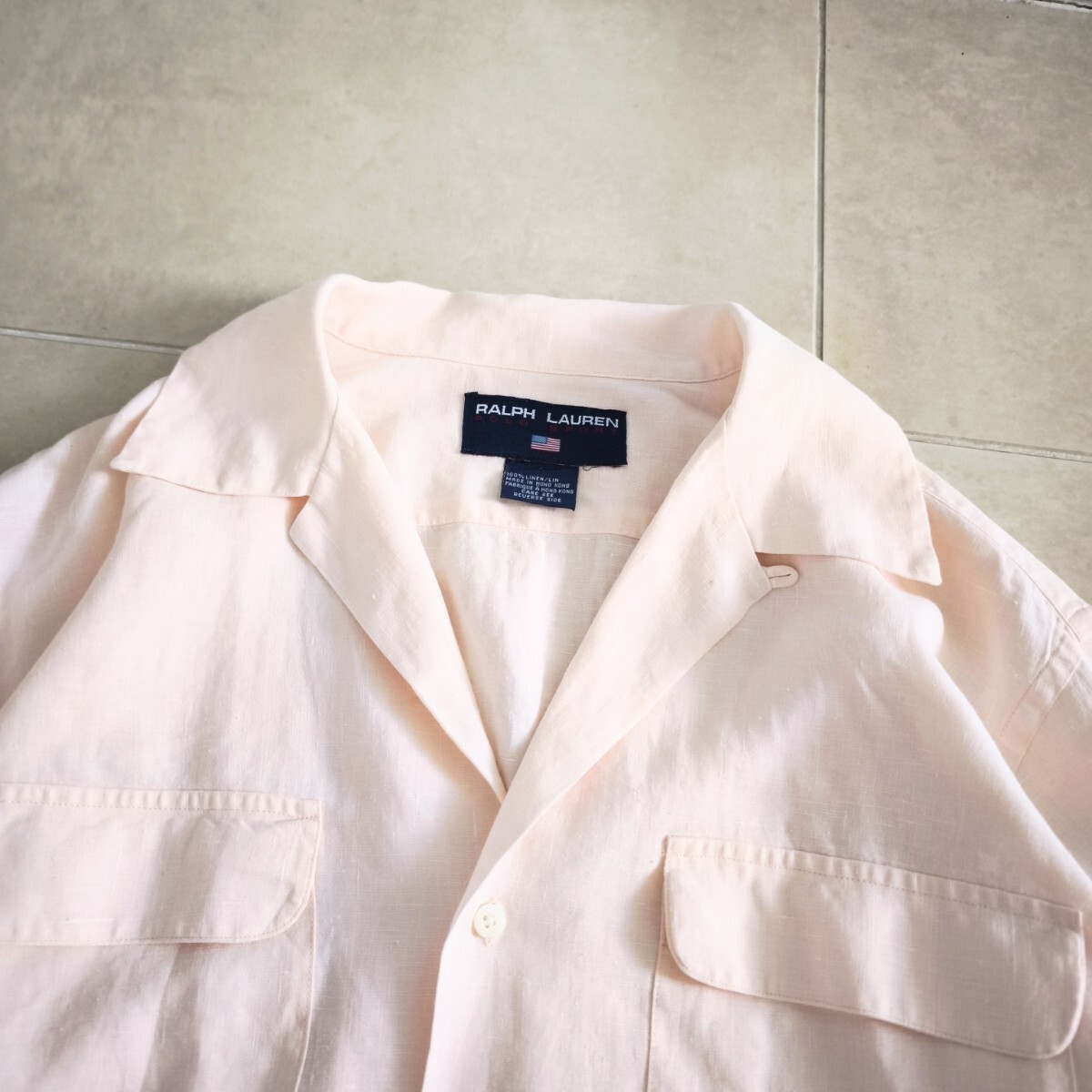 90年代ポロスポのオープンカラーシャツ。ピンクのリネン開襟のボックスシルエット。ボタン1つ欠品。