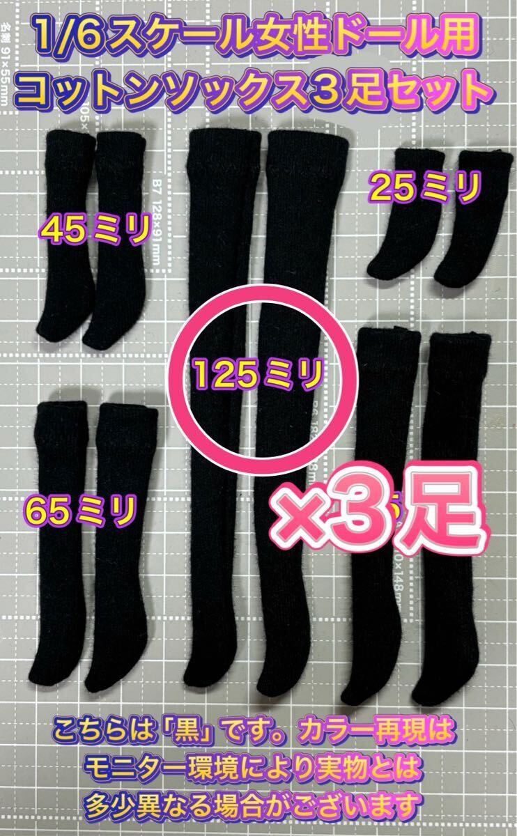 リカちゃん、ジェニー、ネオブライス、アイシードール 、オビツ27女性ボディ、ハッシュタグボディなどが着用出来る、ごくシンプルな綿のソックス長さ違い、平置きで約125ミリの3足セットです。