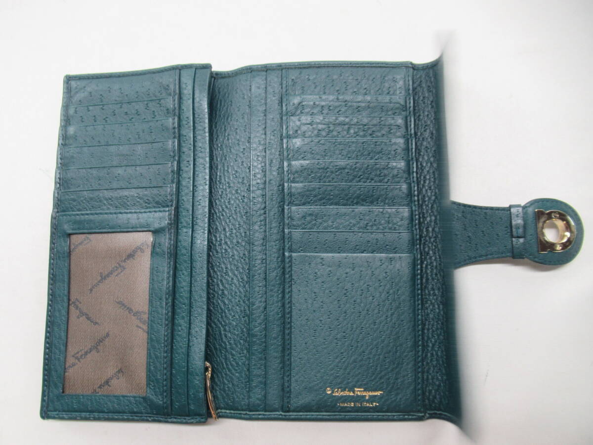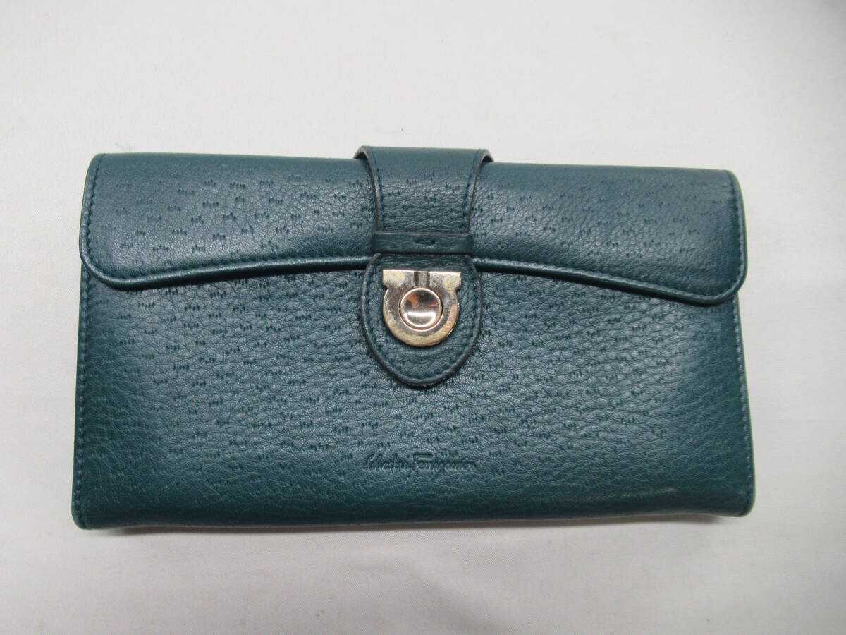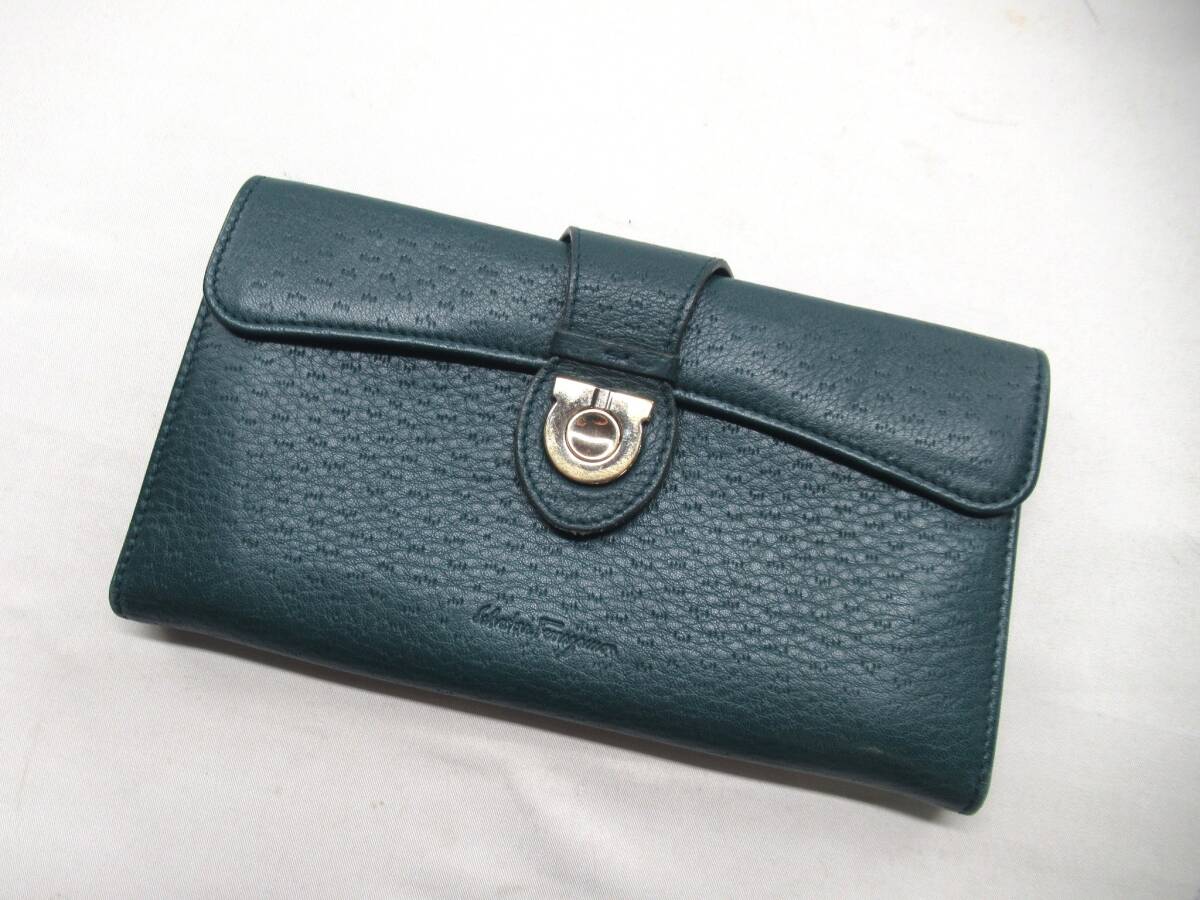 ★【B送900円】2418 Salvatore Ferragamo サルヴァトーレフェラガモ ガンチーニ 長財布 グリーン系 ゴールド金具 イタリア製
