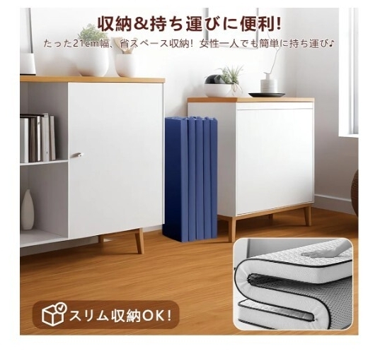 省スペースで暮らしがスッキリ:狭いお部屋やワンルームでも大活躍。使わない時は折りたたんでコンパクトに収納できるので、生活スペースを圧迫しません。来客用やサブ寝具にもぴったりな「折りたたみマットレス シングル」です。