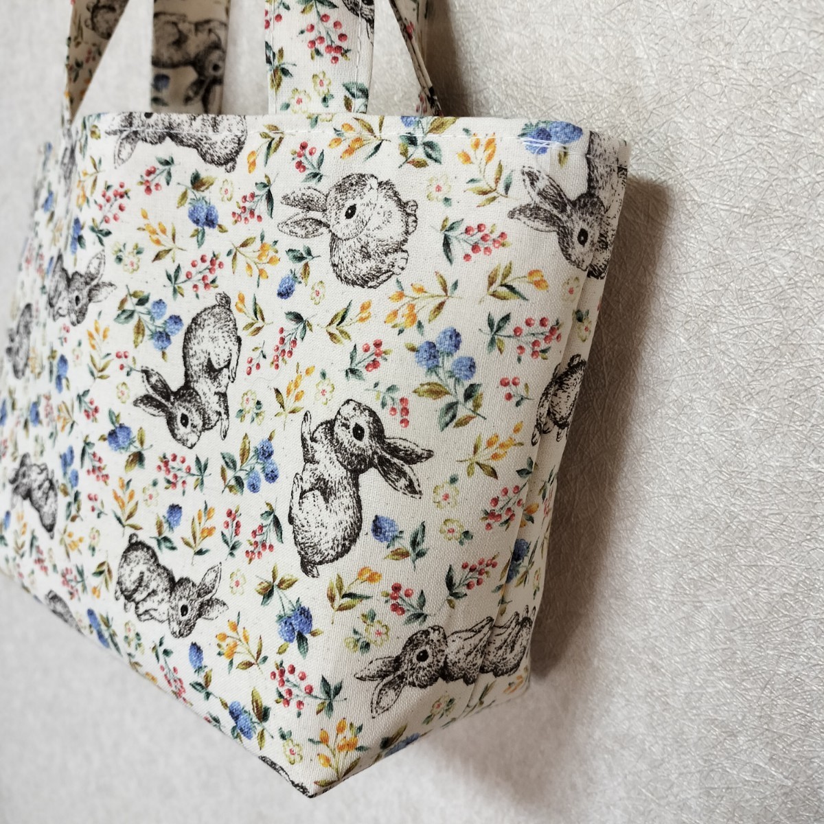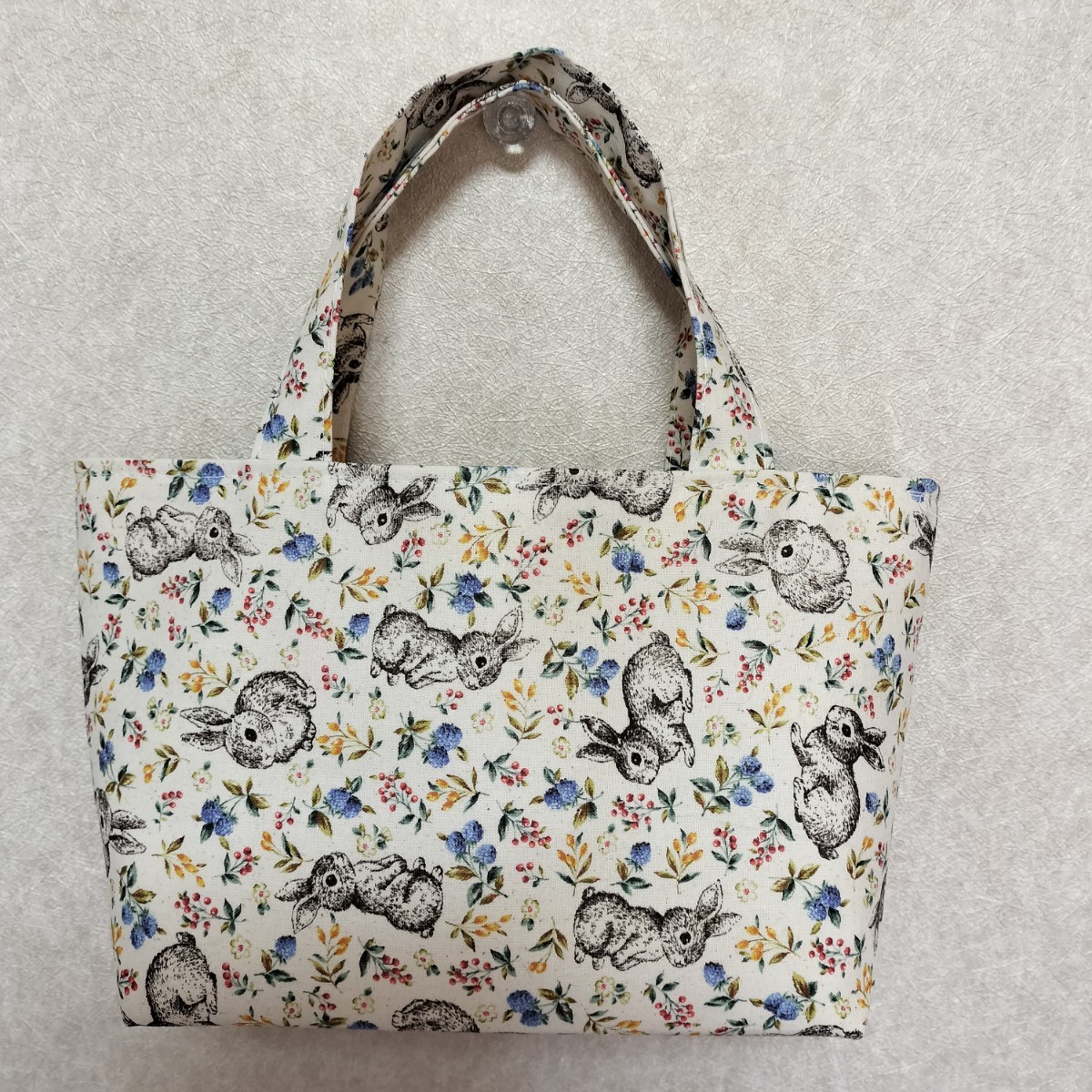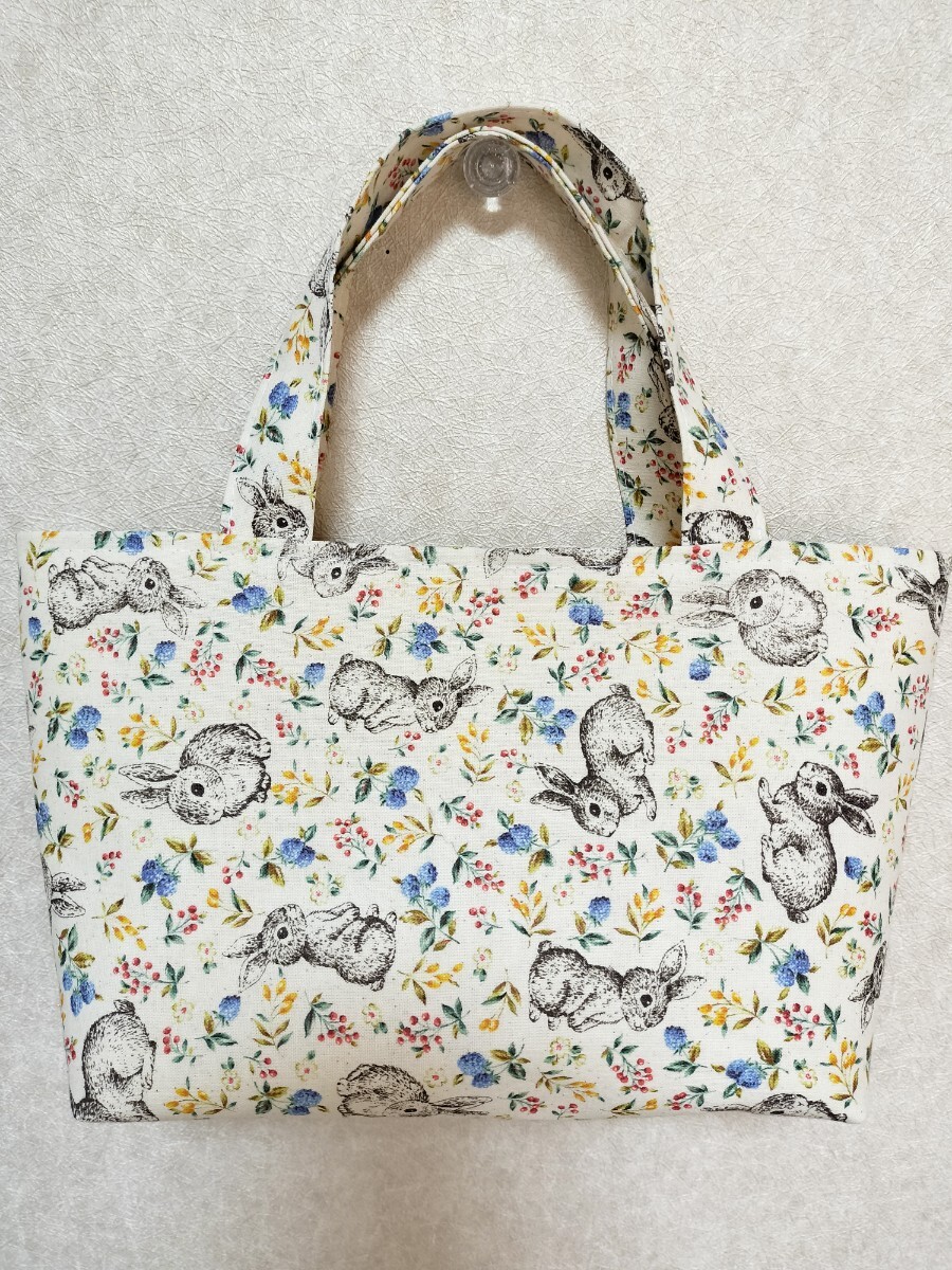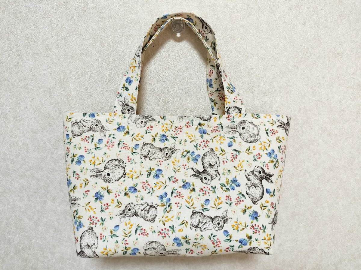 ウサギ柄のトートバッグです。ちょっとしたお出かけ、お散歩バッグ、お弁当バッグ、手提げバッグ、スマホ入れなどにいかがでしょうか。