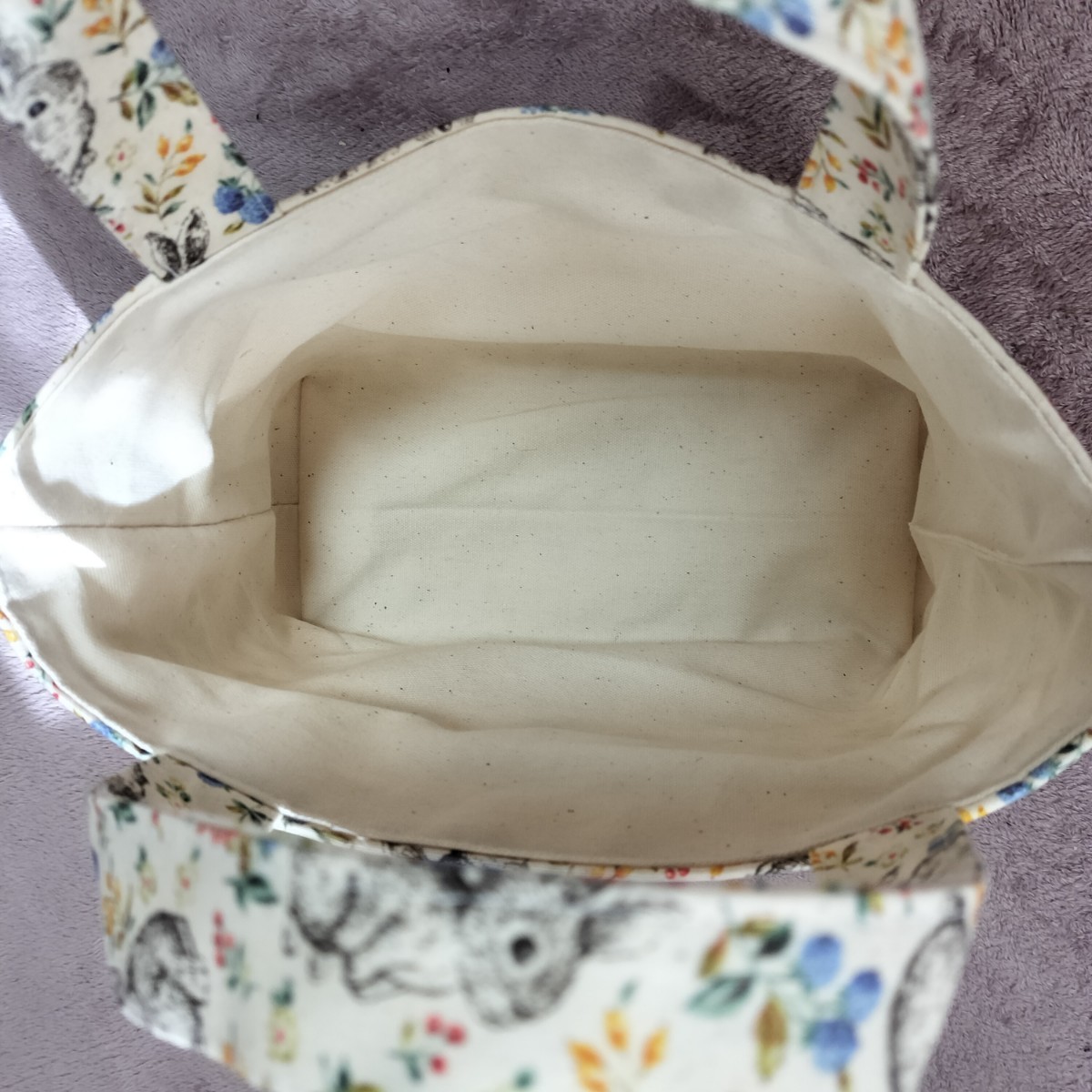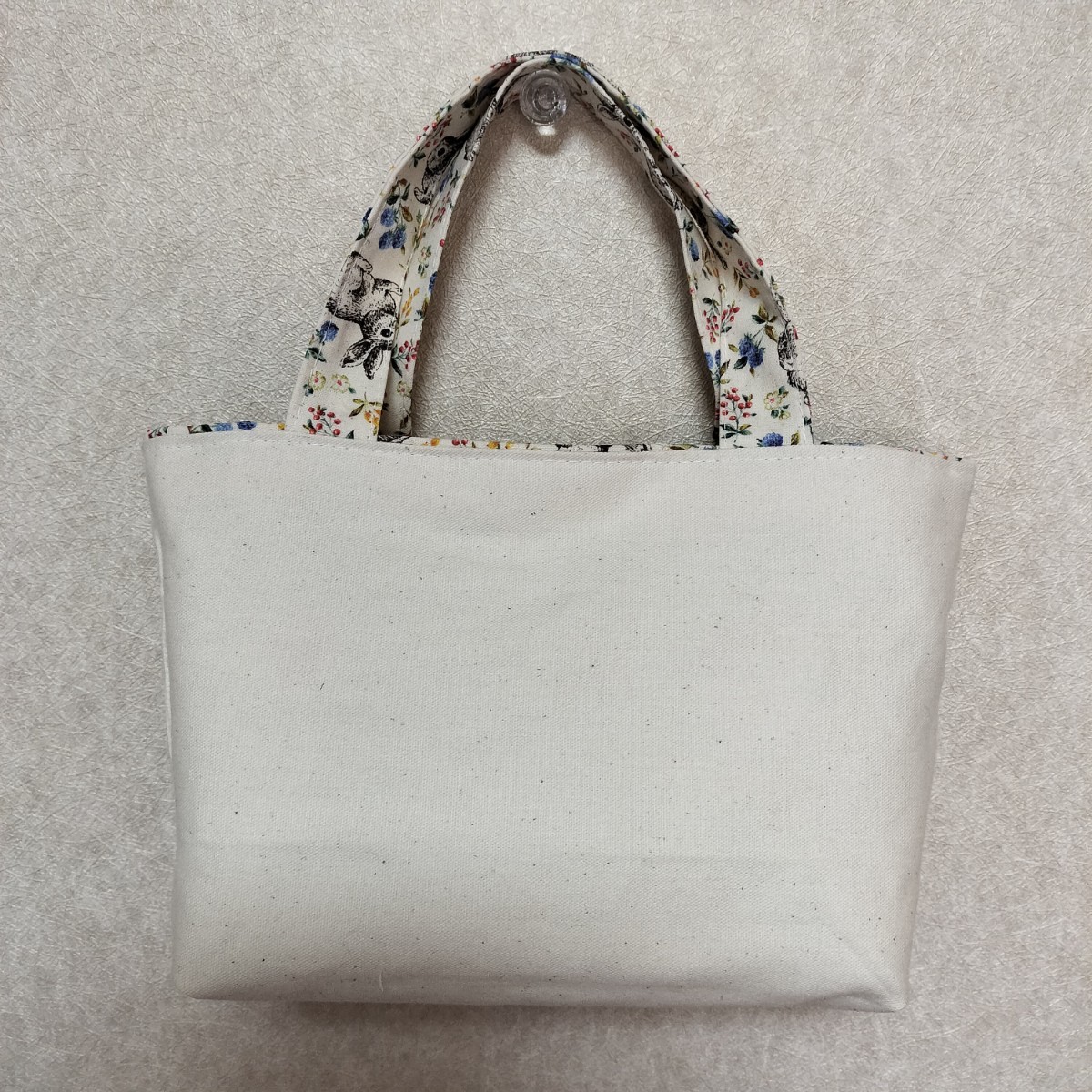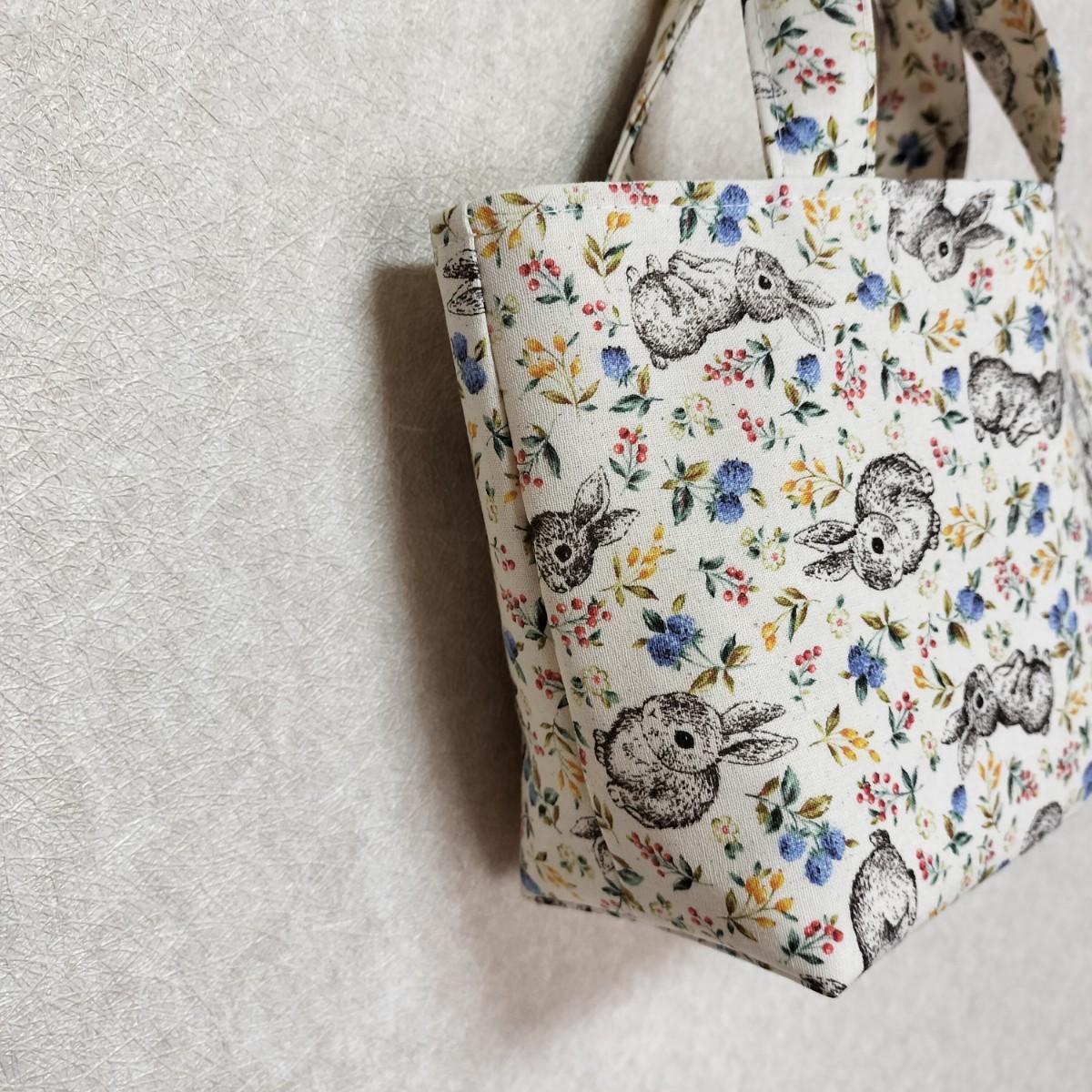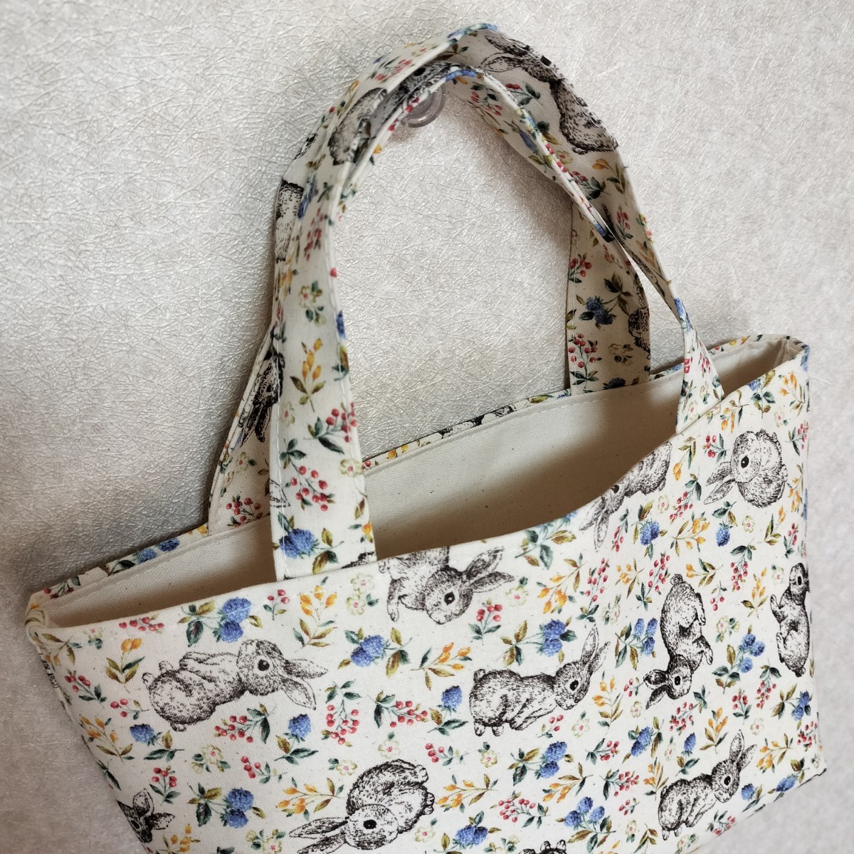 ウサギ柄のトートバッグです。ちょっとしたお出かけ、お散歩バッグ、お弁当バッグ、手提げバッグ、スマホ入れなどにいかがでしょうか。