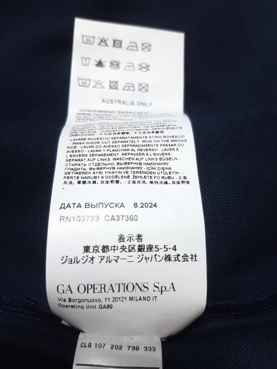 現在は並行輸入品でも、服の内部に付いた品質表示のタグには日本語で、【表示者 ジョルジオ アルマーニ ジャパン株式会社】と記されていることを理解しておいてください。また、輸入元の海外は日本ほど商品の扱いが丁寧ではありません。生地に若干のスレなどがある場合があり、目立つものは記しますが、目立たないものに関しては記しませんので、完璧な商品をお求めな方は正規店をご利用ください。