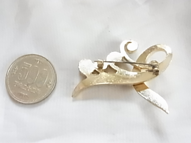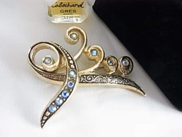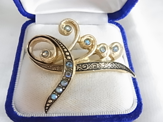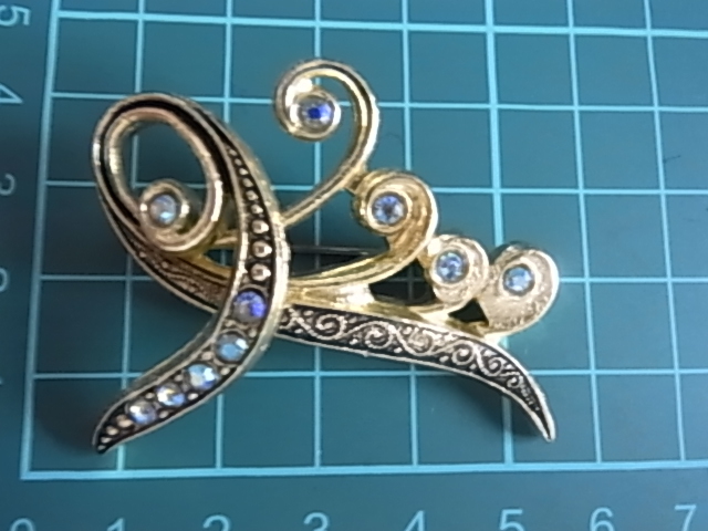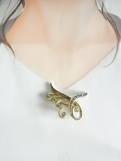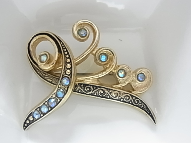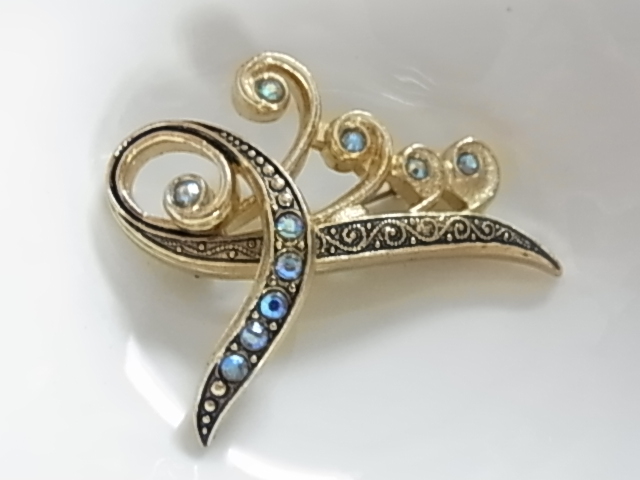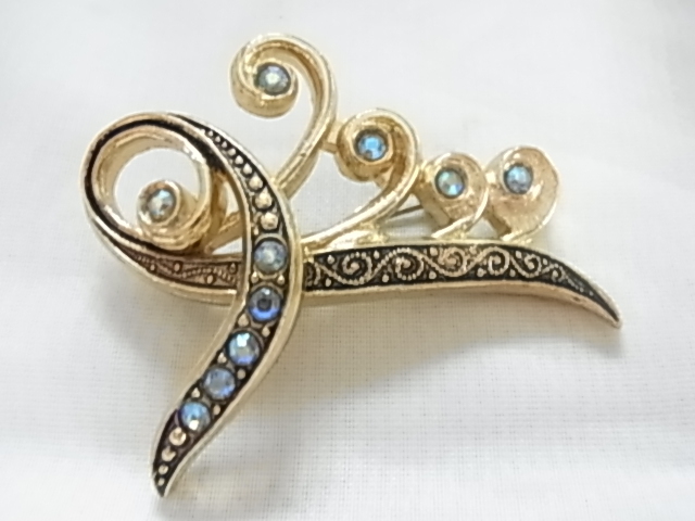 ビンテージ/ヴィンテージ オーロラ調に輝くラインストーン 金色トーン ゴールドトーン 軽量なのに豪華感の印象 レトロのブローチ★