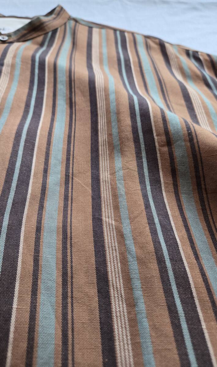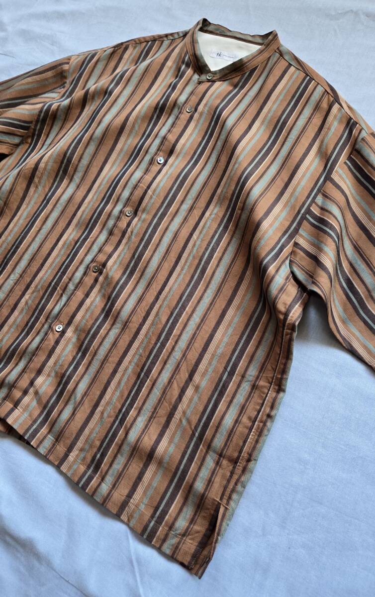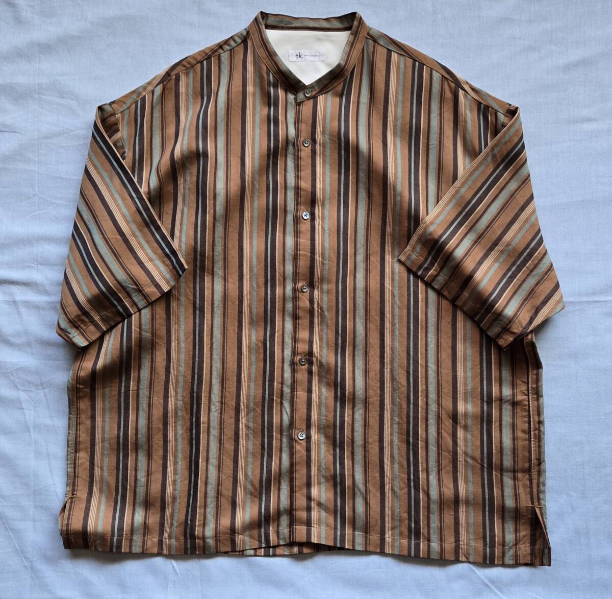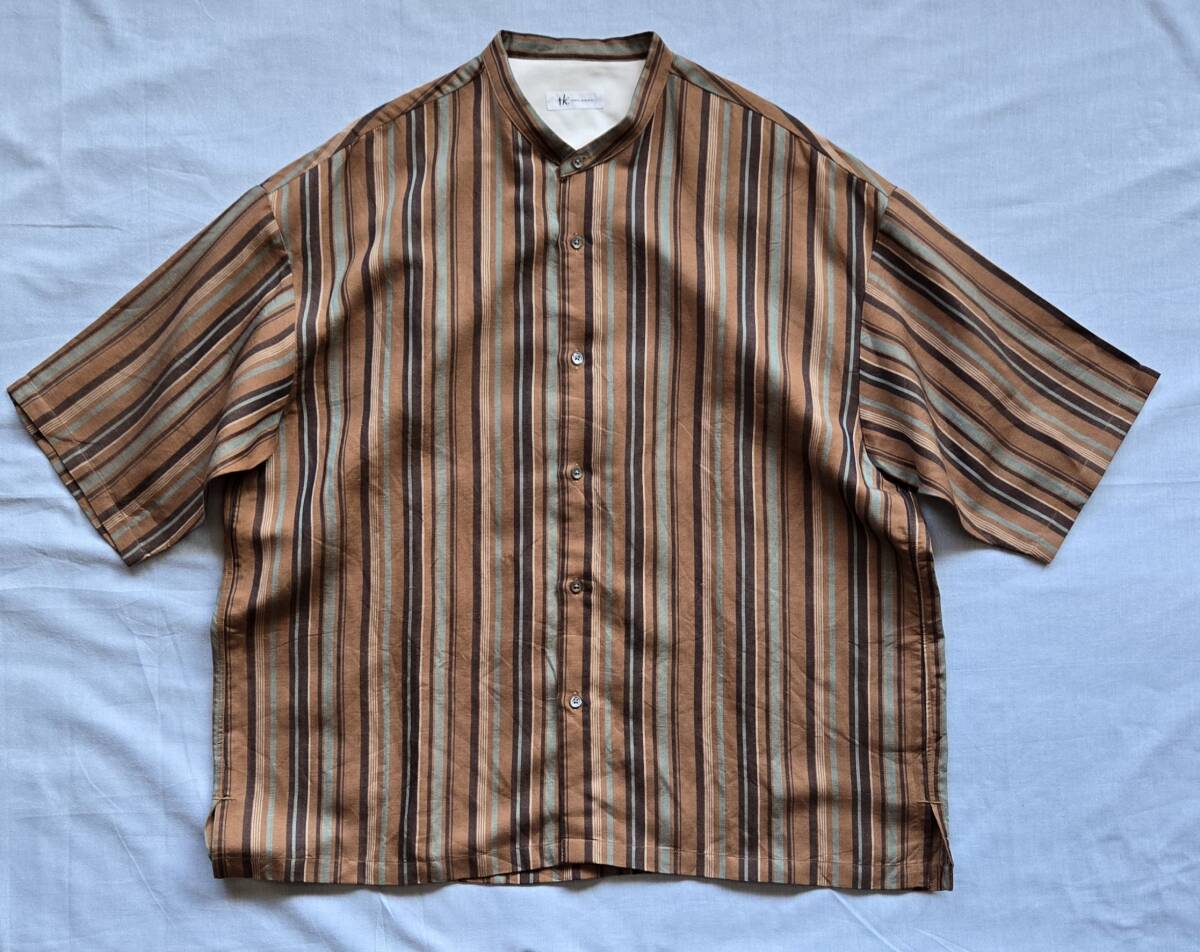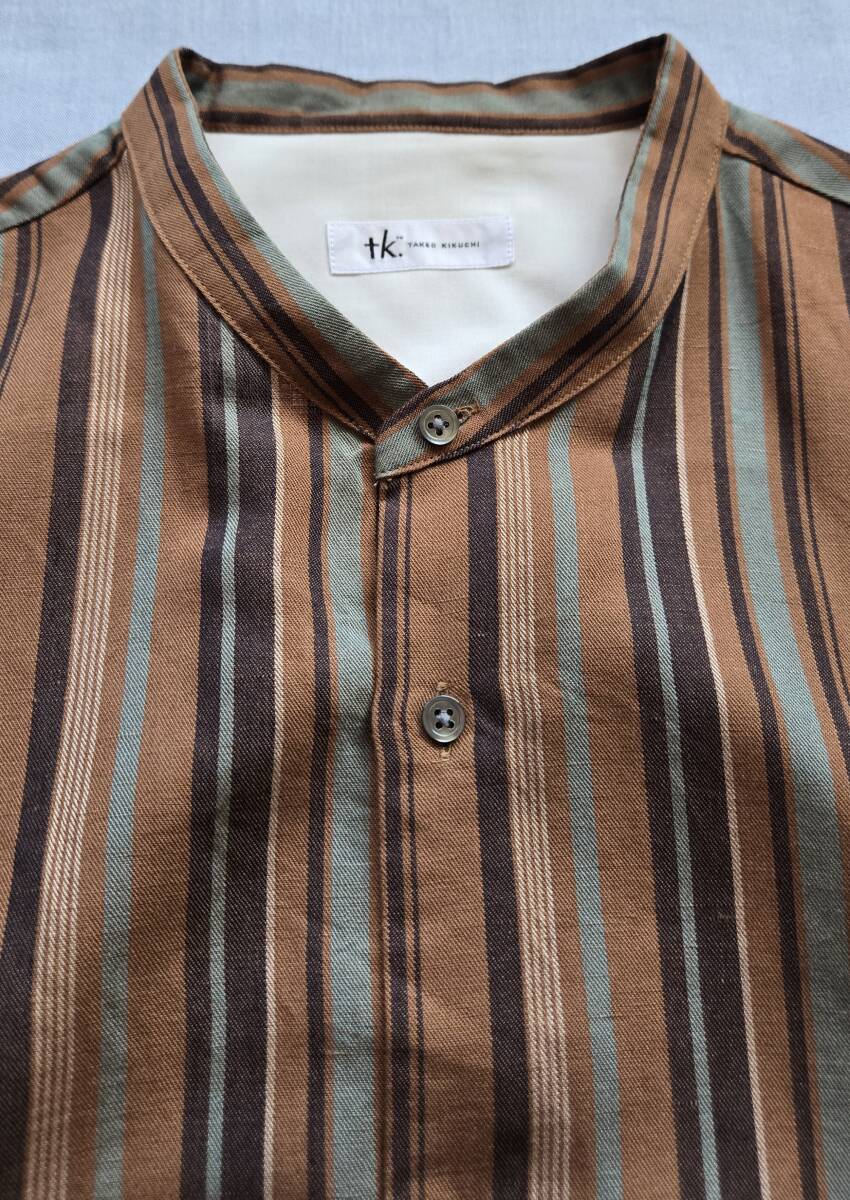 送料無料 tk. TAKEO KIKUCHI タケオキクチ 麻 セルロース リネン マルチ ストライプ スタンドカラー バンドカラー 半袖 シャツ TK