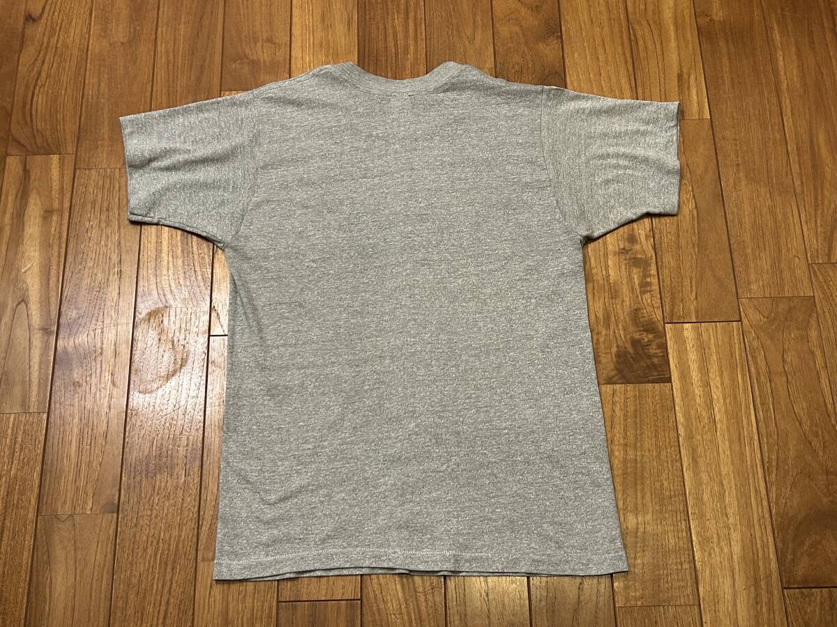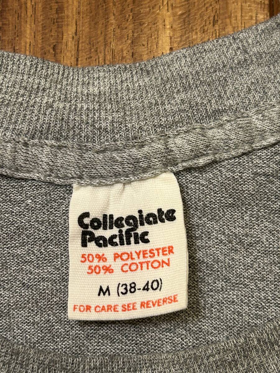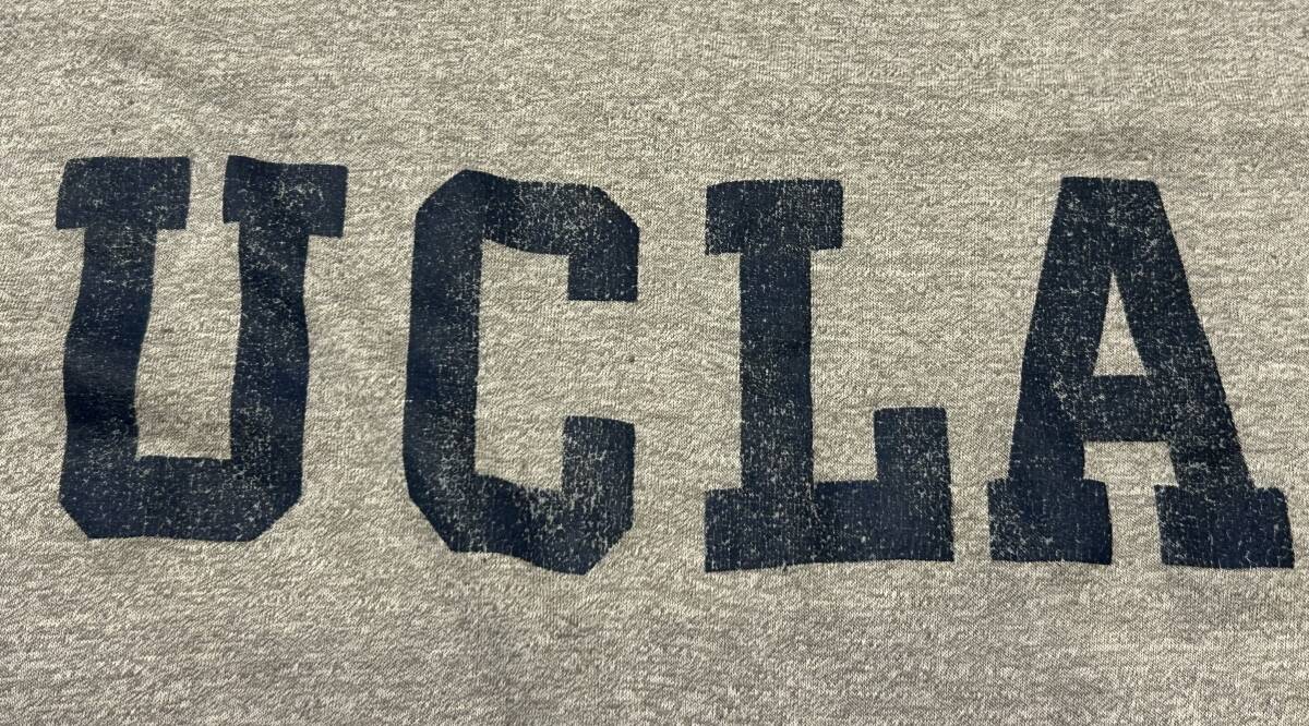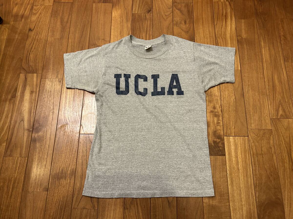 70年代製のCollegiate PacificのUCLAカレッジプリントTシャツ。表記サイズM 、50%COTTON、50%POLYESTER、アメリカ製。身幅46cm、肩幅40cm、袖丈18cm、後着丈63cm。ユーズドにつき、ノーリターン、ノークレームでお願いいたします。