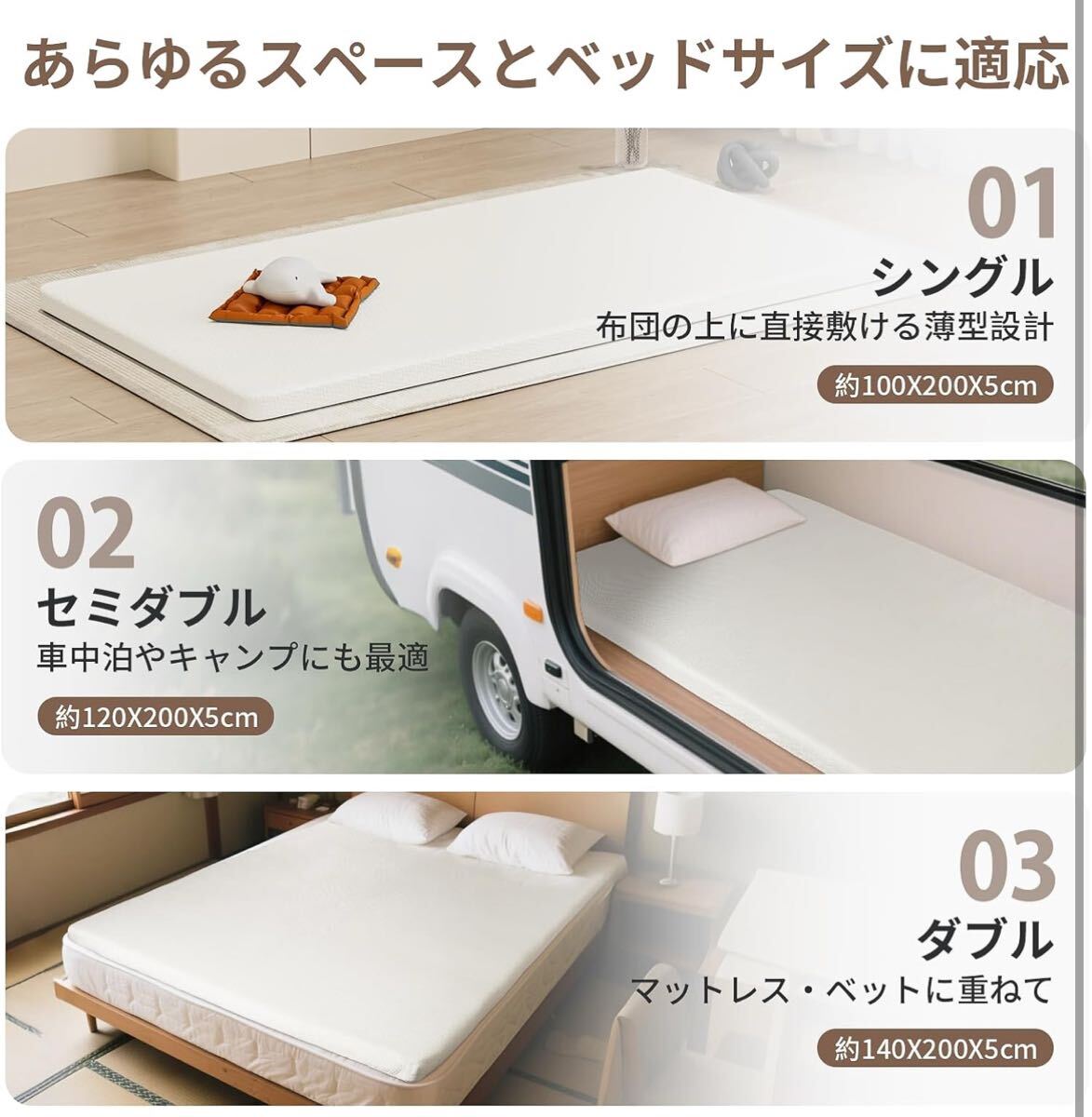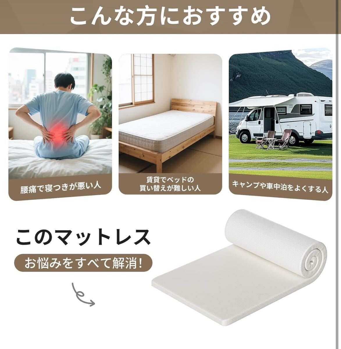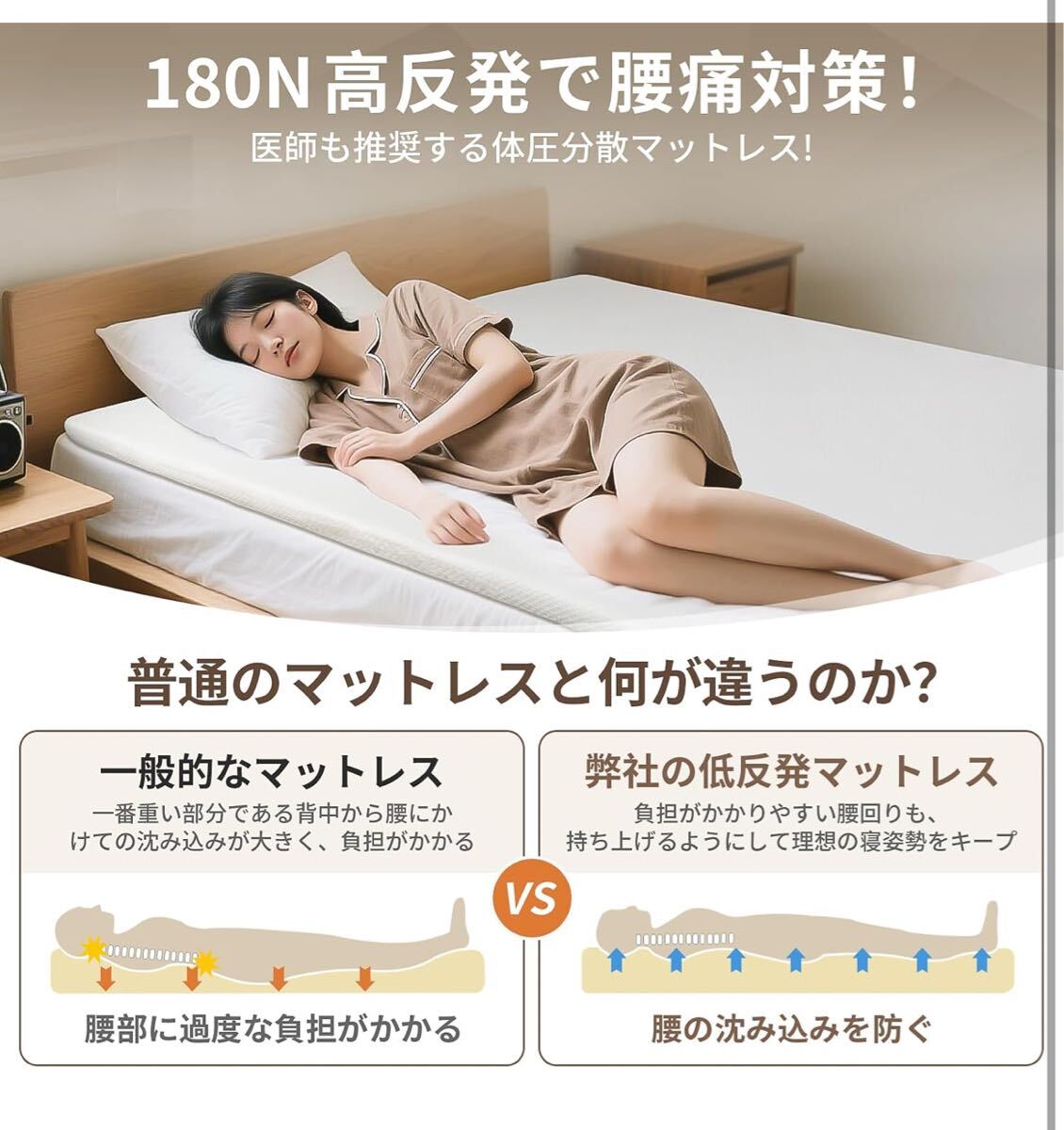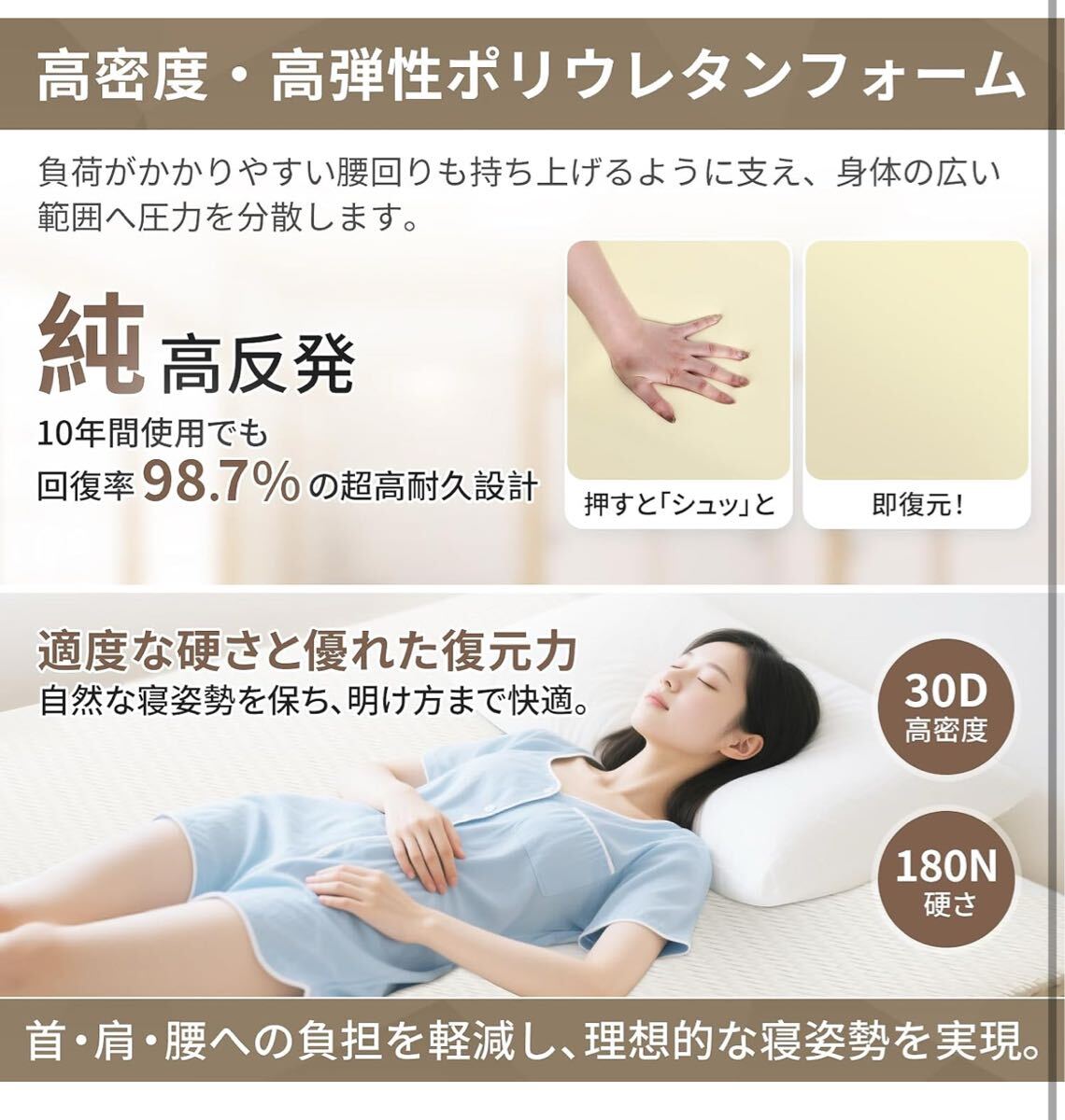 【腰の悩みから解放】「体が痛い・寝心地が悪い・腰が痛くなる」等が発生する場合にお使いいただけます。30D高密度ウレタンフォーム採用で、体圧分散効果が高く、長時間使用でもへたりにくい設計です。お客様のお好みに合わせ、お手持ちの寝具に重ねるだけで極上の寝心地と、健やかで輝かしい目覚めが手に入ります。布団の上に敷いても、フローリングに直接敷いてもOK。さまざまなシーンでご利用いただけます。新感覚の寝心地をお試しください。