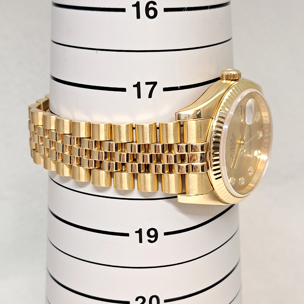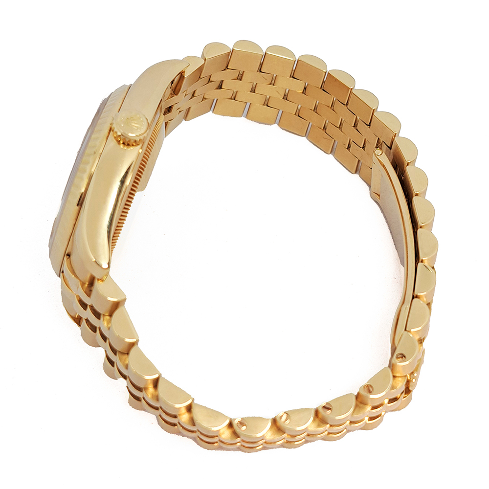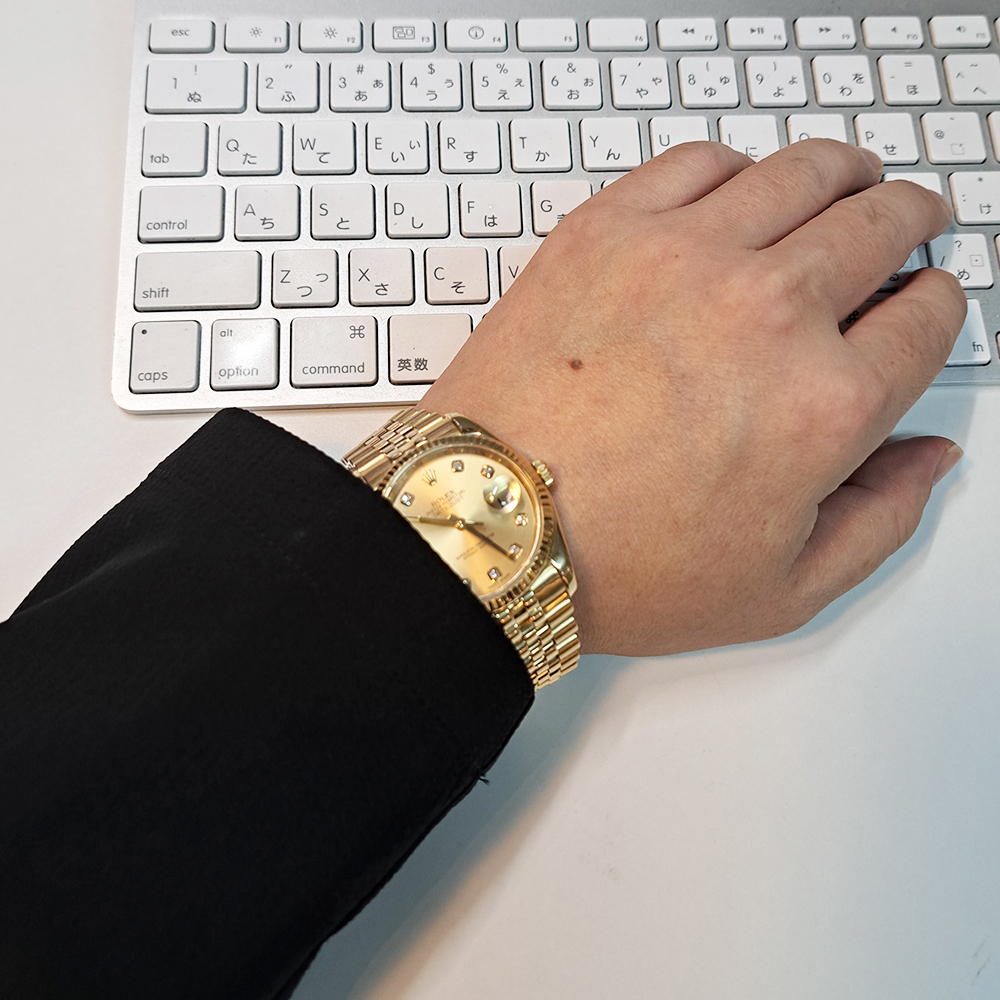 コメント | ロレックス デイトジャスト 116238Gが入荷致しました。金無垢素材とダイヤルに10Pの純正ダイヤモンドをセッティングしたとてもゴージャスな逸品です。こちらの商品はルーペで拡大すると、風防ガラスに微細なカケがありますが、肉眼ではそれ程気にならない程度です。ギャランティに2016年にスイスにて購入した記載があります。 ~出品担当の中村より~ デイトジャストの定番人気モデルで、 まばゆい華やかさを演出するイエローゴールドのケースに、シャンパンカラーのダイヤルの組み合わせが、ワンランク上のラグジュアリー感を演出しています。 | ||