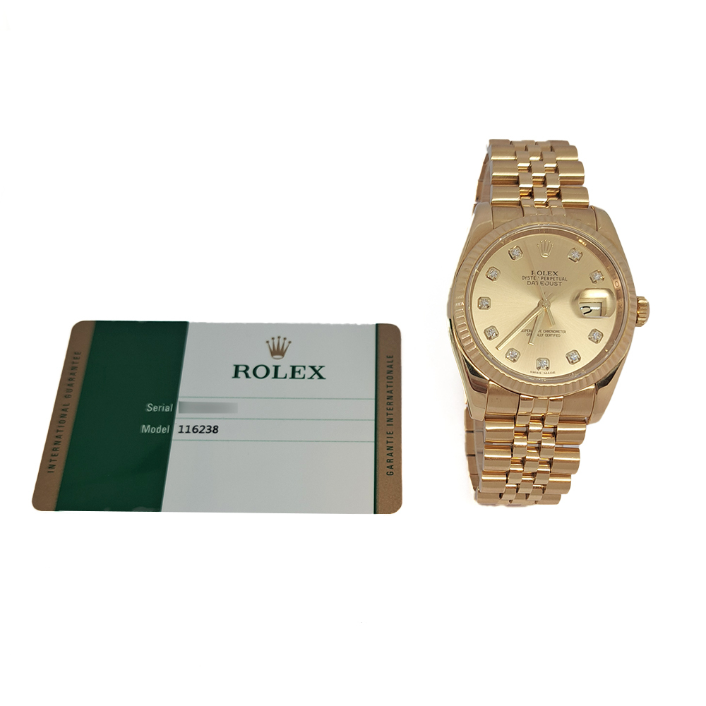 商品名 | ロレックス デイトジャスト 116238G ランダム番 ルーレット刻印 金無垢 10P純正ダイヤ ギャラ付 メンズ 自動巻 時計 | ||