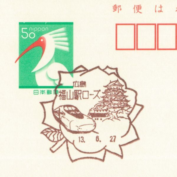 風景印☆初日☆広島・福山駅ローズ・H13.6.27・新幹線・変形枠