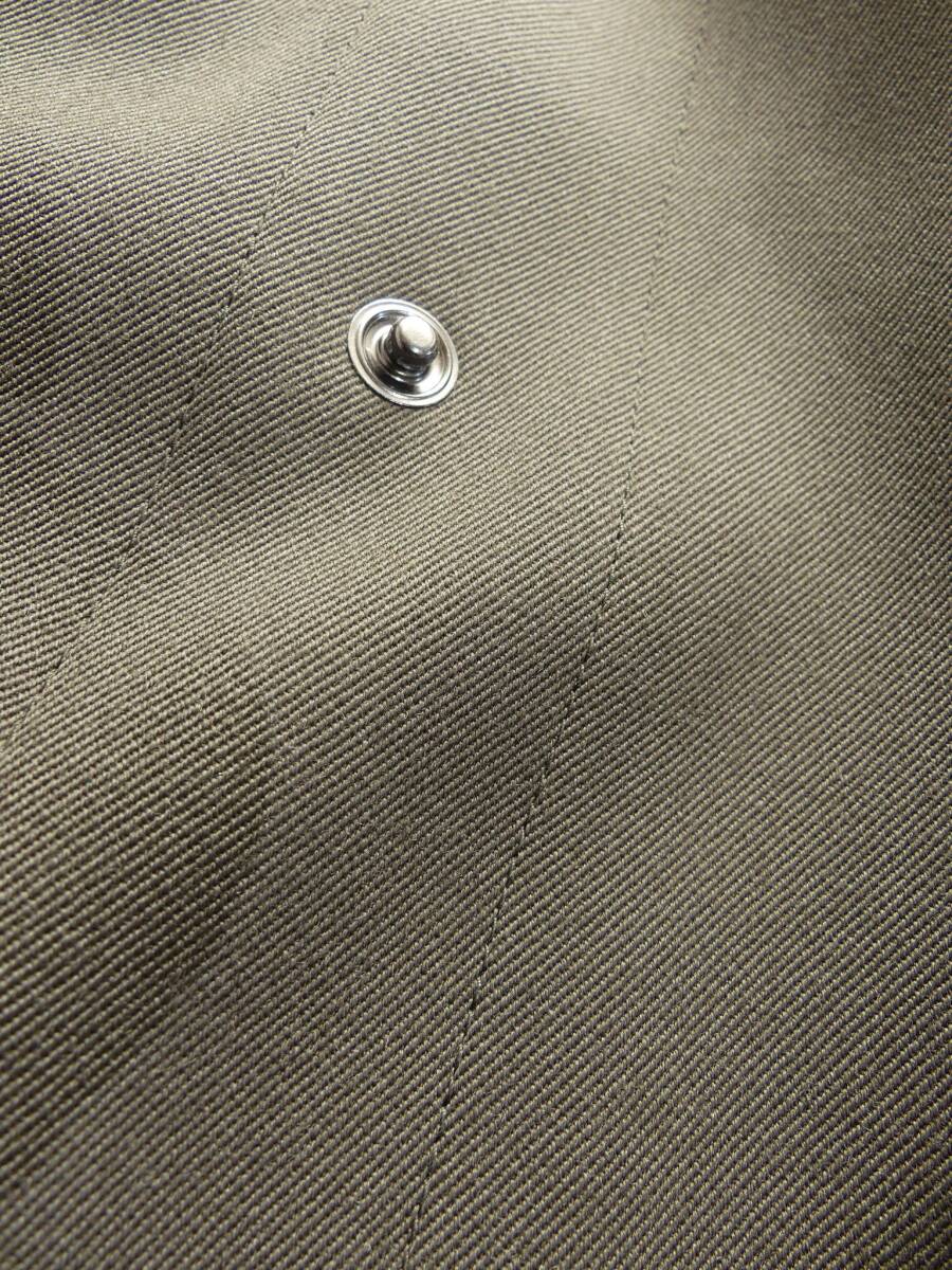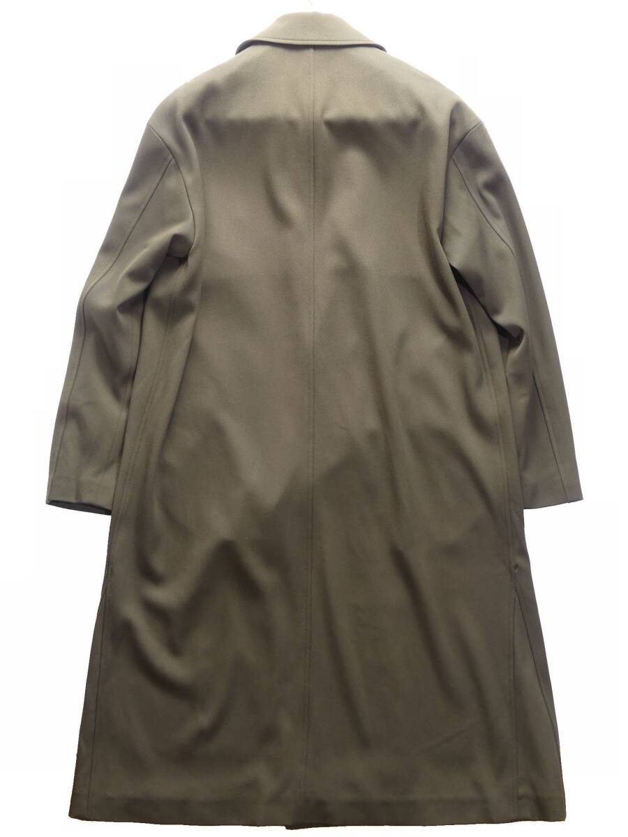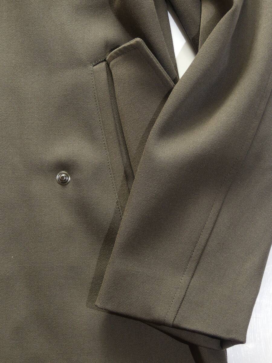 思いっきり目の詰まったバイアス織りツイル生地のバルマカーンコート。ミラノ秋冬コレクションのランウェイに登場したジョルジオ最高峰コレクションピースです。ベンタイル生地に似た超高密度ツイル織りで雨風を通しにくく、熱を逃がしにくいため保温性も確保。バイアス織りの副産物でナチュラルストレッチの機能もあります。前身ごろは簡易感のあるシンプルなスナップボタン仕様で、ダブルブレストのように打ち合わせがたっぷり深く作られています。裾にかけて少しだけ身幅が広がっているAラインシルエット。ミニマリズムを追求したかのような削ぎ落し系で、それでいて優れたデザイン性があります。さらに上質な生地艶、シックな色で、主張するデザインなどが一切なくても明らかに人とは違うクラス感、奥深い雰囲気があります。さすがのジョルジオコレクション物です。着用シーズンはもちろん秋冬。しっかりした厚手生地で12月からシーズンスタート。3月までご着用いただける防寒コートになります。