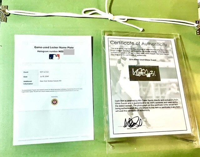 イチロー選手激レアヤンキースヤンキース時代実使用エルボーガード+フォト直筆サイン、実使用ロッカーネームプレートセットです。
