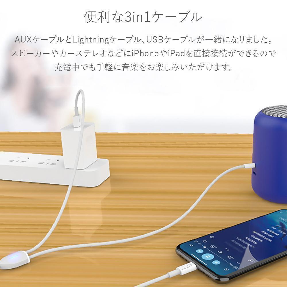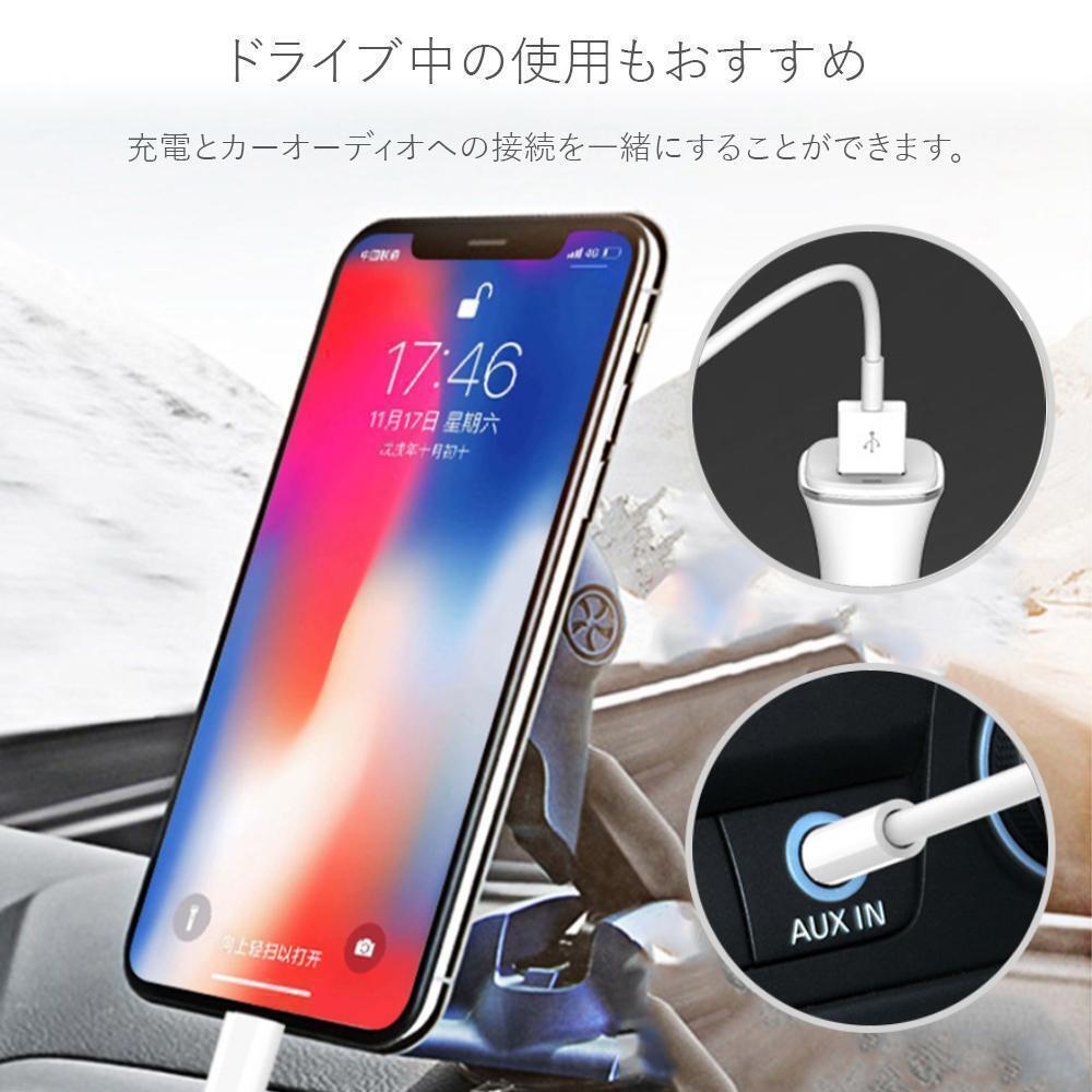 ライトニング端子 + USB充電コネクタ+3.5mmジャックが備えたiPhone オーディオケーブルです。