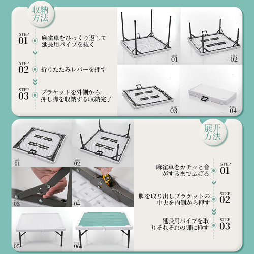 • 【収納方法】①麻雀卓をひっくり返して延長用パイプを抜く②折りたたみレバーを押す③プラケットを外側から押し脚を収納する収納完了