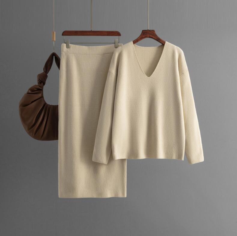 346 スカートスーツladiesレディース ◇ 秋冬  上質 ◇   暖かい  厚手  ニット素材   Vネック   ベージュ