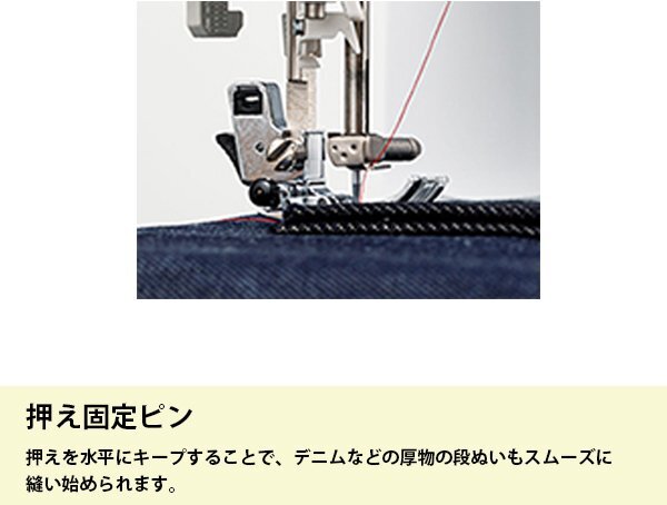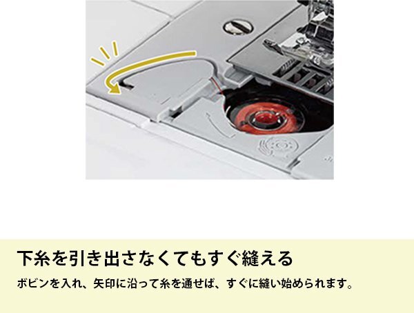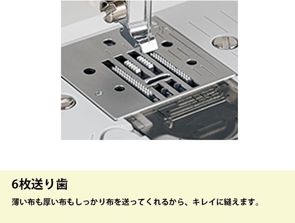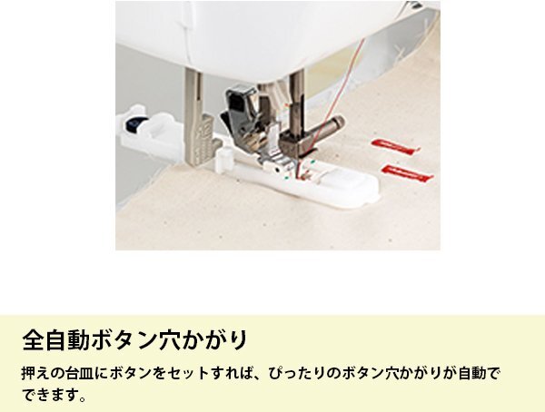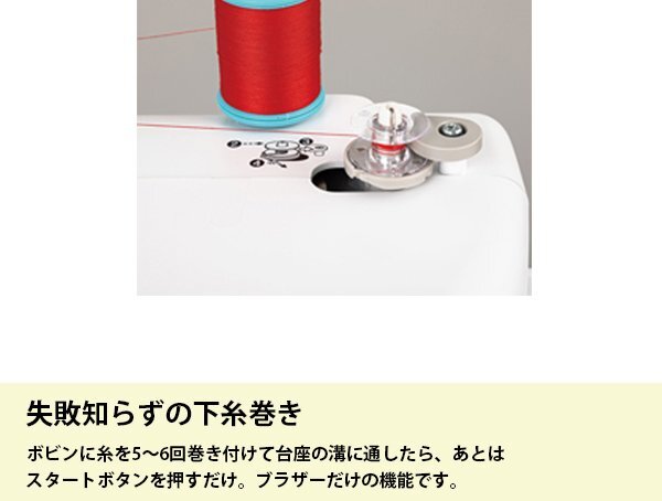 | ♪主な機能 | ●3ステップ糸通し:面倒な針穴への糸通しは、レバー操作で簡単です。●失敗知らずの下糸巻き:ボビンに糸を5~6回巻き付けて台座の溝に通したら、あとはスタートボタンを押すだけ。ブラザーだけの機能です。●下糸を引き出さなくてもすぐ縫える:ボビンを入れ、矢印に沿って糸を通せば、すぐに縫い始められます。●模様選択もらくらく:軽いタッチのボタン操作で模様を選ぶことができます。●自動返しぬい/止めぬい●ぬい目お好み調整●6枚送り歯:薄い布も厚い布もしっかり布を送ってくれるから、キレイに縫えます。●押え固定ピン:押えを水平にキープすることで、デニムなどの厚物の段ぬいもスムーズに縫い始められます。●簡単糸調子:厚物から薄物までキレイに縫うための標準値を分かりやすく色付け。●ぬい模様20種類:作品作りの幅を広げる実用模様を搭載。●全自動ボタン穴かがり:押えの台皿にボタンをセットすれば、ぴったりのボタン穴かがりが自動でできます。●針停止位置切替:布をターンさせやすい針下停止と布を取り出しやすい針上停止を自在に使い分けられます。●ドロップフィード:送り歯を下げられるので、布を自由に動かしながら縫うことができます。●一針縫い:針上下スイッチを押すことで、一針縫いが簡単にできます。 |