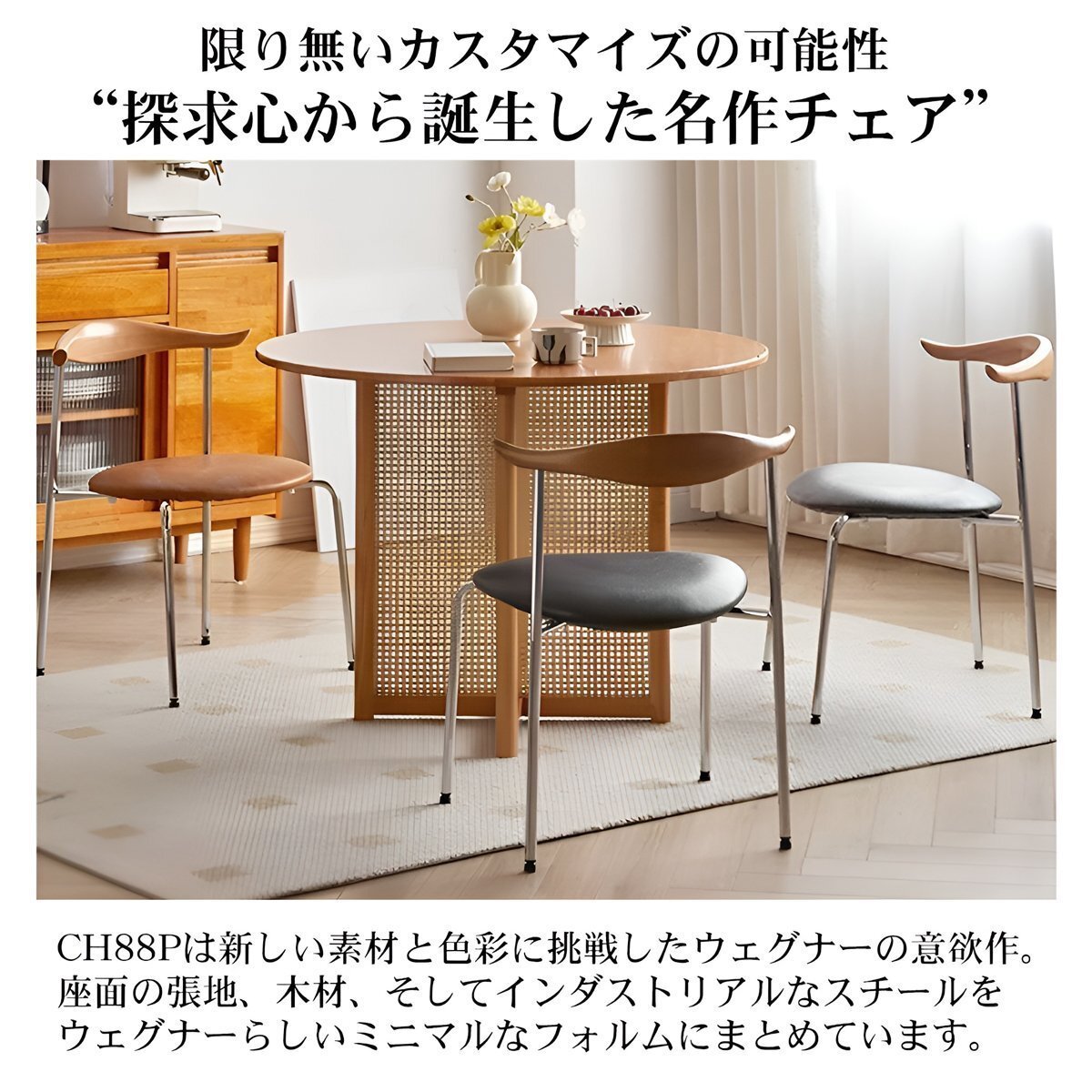 ![]() 探究心から誕生した名作チェア CH88Pはハンス J. ウェグナーの木材とスチールを混合するという、 斬新なデザインアプローチから生まれた逸品、素材の資質を追求すると同時に 色彩にもこだわったウェグナーの意欲作です。 ダイニングチェアCH88Pは、新しい素材と色彩に挑戦したウェグナーの意欲作。 座面の張地、木材、そしてインダストリアルなスチールをウェグナーらしいミニマルなフォルムにまとめています。 ダイニングチェアとしてはもちろん、会議室、レストランなど幅広い用途に。 特徴となっている角の様なデザインのゆったりとしたバックレストは、 体をきちんと支えるようデザインされ、肘を置いてくつろぐこともできます。 1955年にスウェーデンで開催されたヘルシンボリ国際博覧会(H55) に出展するために ウェグナーがデザイン。置く場所を考慮し、スタッキングも可能です。 自然素材である木材と工業製品であるスチールを美しく融合したデザイン。 ミニマルなフォルムながら、使用感に優れたチェアです。 デザイナー:ハンス・J・ウェグナー/ Hans J. Wegner サイズ:本体約 幅57cm*奥行き43cm*高さ72cm*座面高42.5cm 重量(約):3.8kg ・材質: 背もたれ:無垢材 座面:ブラックレザー(PVC) 脚部分:スチール ●注意事項 ※この商品はリプロダクト品になります。カール・ハンセン&サン社の商品ではありません。 ・この商品は海外からの輸入品の為予告なく変更する場合が御座います。 ・新品ですが輸入品の為、商品到着時に若干の小傷、汚れ、塗装のムラ等ある場合が御座います。 予めご了承くださいます様宜しくお願い致します。 ・PCのモニターにより実際の商品と色味が多少異なることがございます。 ・落札後のキャンセル及び別商品への交換、入札の取り消しは出来ません。 ・万が一、当製品を使用した事で損害などが発生いたしましても責任は負いかねますのでご了承下さい。 |