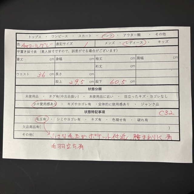・毛玉有(小さな毛玉がポケット付近、腰まわりに有)