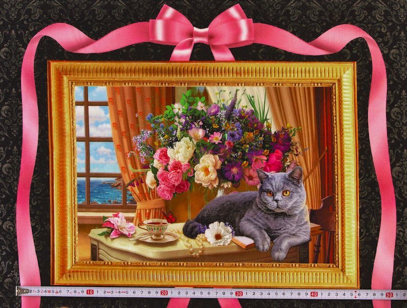 約横41cm、約縦30cmの額縁に入れたネコと静物の油絵を3枚、縦に並べたようなタペストリー・パネル柄。
