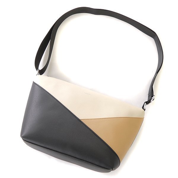 大胆なトライアングルのステッチワークが目を引くショルダーバッグ。 コンパクトなサイズ感ながらもマチ幅をしっかりと確保しており、600mlのペットボトルも楽々収納可能な優れた収納力を備えています。 素材には軽量で持ちやすい合成皮革を使用。 長時間のお出かけでも負担が少なく、デイリーから旅行まで幅広いシーンで活躍するショルダーバッグです。 【デザイン】 ・ジップで開閉 ・収納内部にポケット1つ |