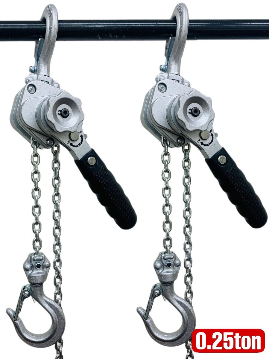 ご注意(免責)> 必ずお読み下さい【安全上のご注意】 1、手動力は、定格巻上げ時、作業者の手動力に負担を掛け過ぎない適切な値としています。 2、実作業は定格荷重内で余裕をもって行ってください。 3、作業前、変形や傷はないか動きはスムーズか確認し、点検で問題のある製品は使用してはいけません。 4、切り替えツマミの位置は、作業方向と一致しているか常に確認しながら作業を行ってください。 5、巻き上下の作業中は、ユーテンニギリに触れてはいけません。 6、巻き下げ操作でロードチェーンが戻らない場合は、荷重がかかり過ぎている事が考えられます。切り替えツマミをDに切り替え反時計回りに力いっぱい回すと解除できます。取り外し後は十分な点検と定格荷重を確認してください。 7、メカニカルブレーキのブレーキパンには油を付けないでください。 8、雨が直接かかるなど、錆の元になるような場所で保管しないでください。 9、注意事項を守らず、誤った使用上の事故や損害について、当社は一切の責任を負いません。