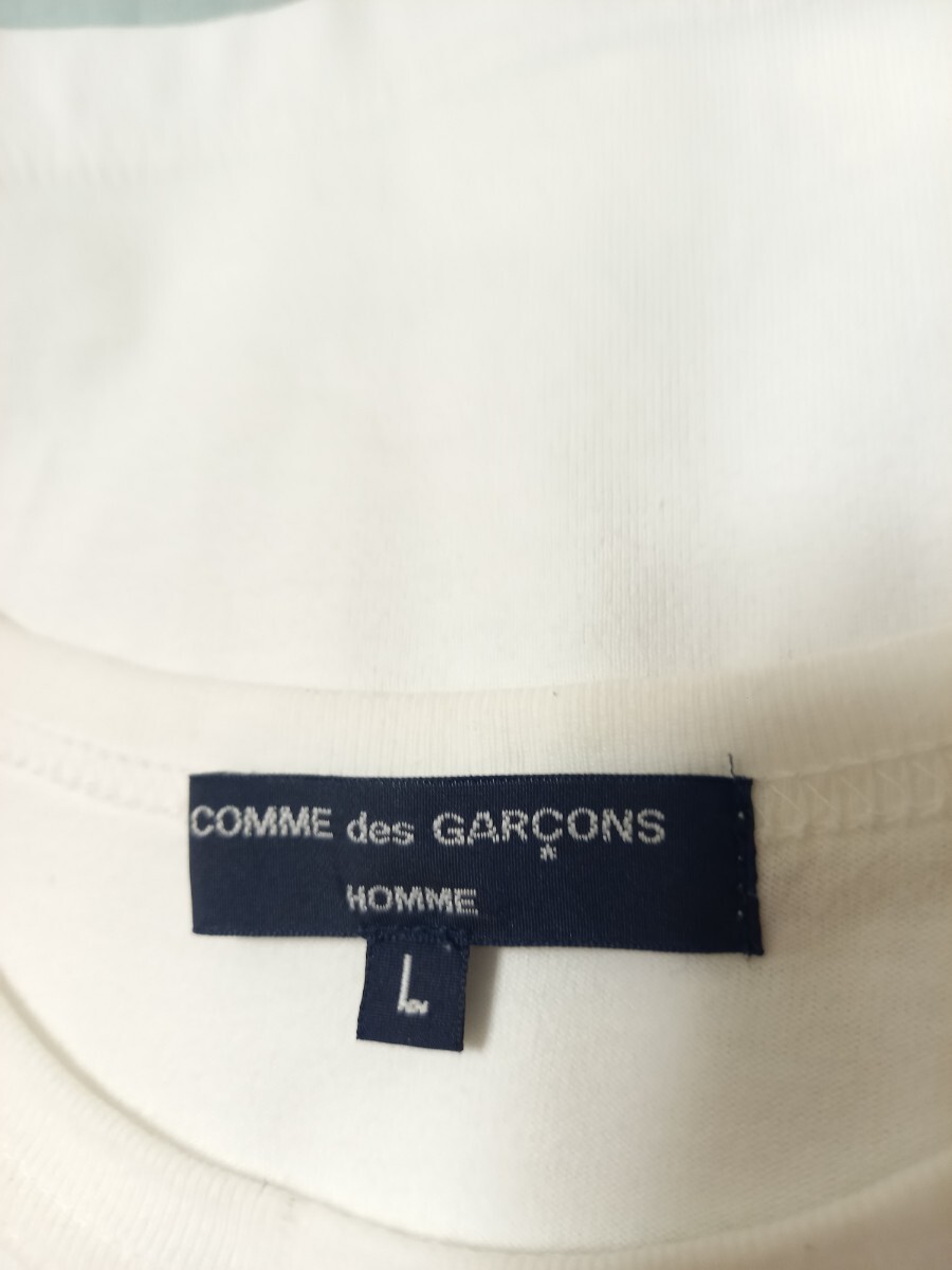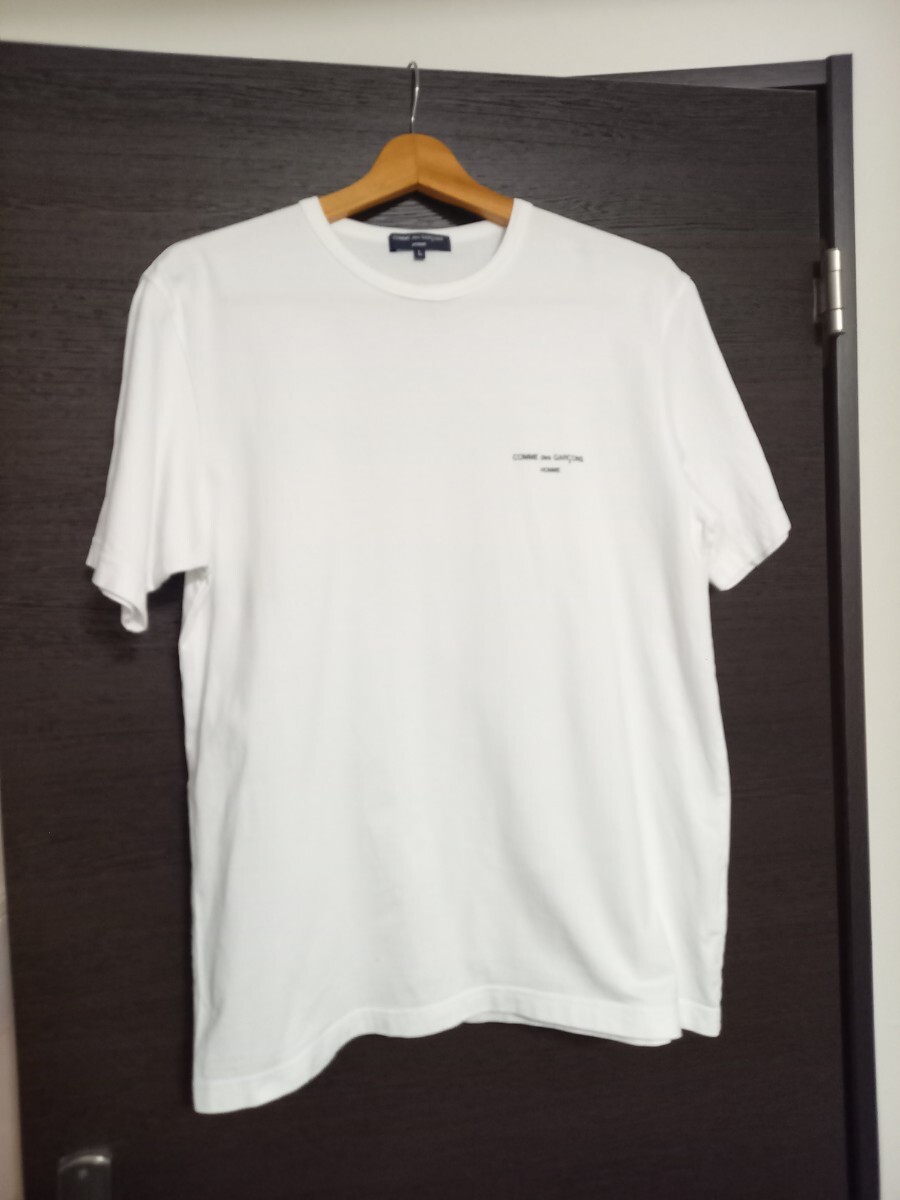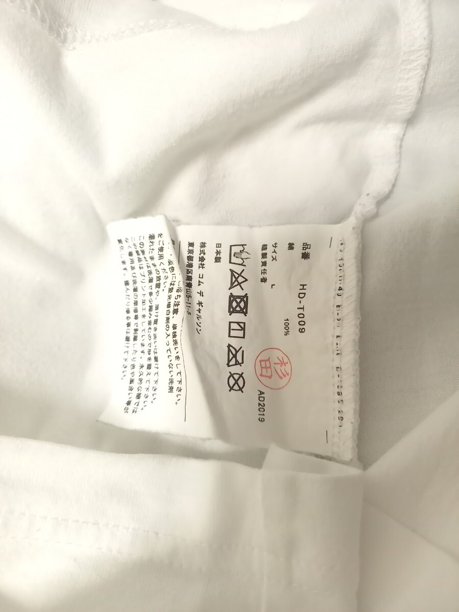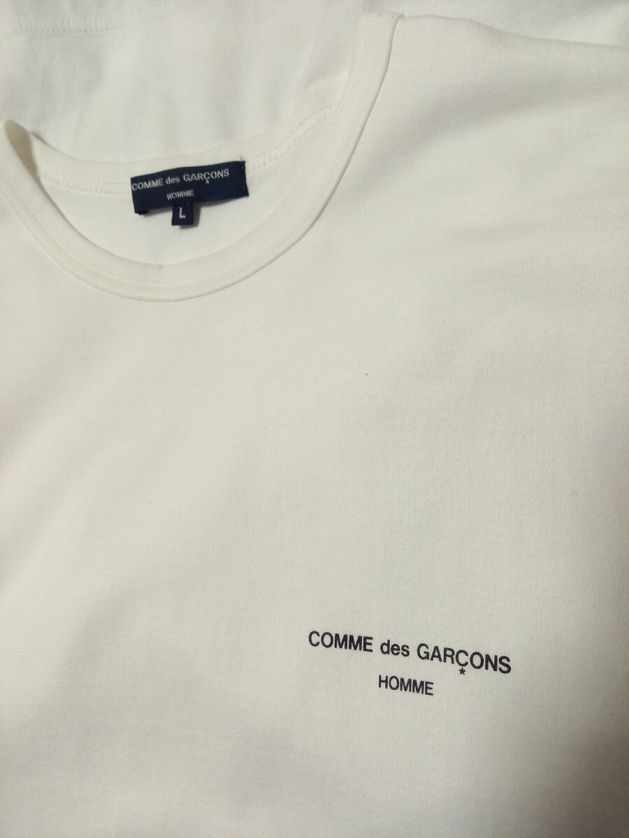 AD2019 COMME des GARCONS HOMME ロゴ ホワイト コムデギャルソンオム 半袖 カットソー archive Tシャツ sizeLです。状態は使用感も少なく全体的には良い方だと思います。肩幅約48身幅約56着丈約70袖丈約23センチです。必ず当方の自己紹介欄を見てから質問、入札、落札してください。ノークレームノーリターンでお願いします。