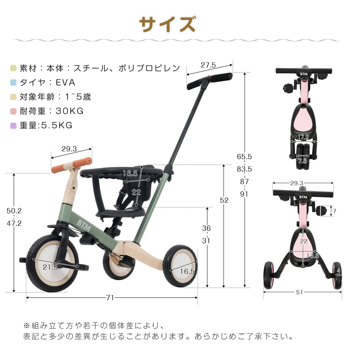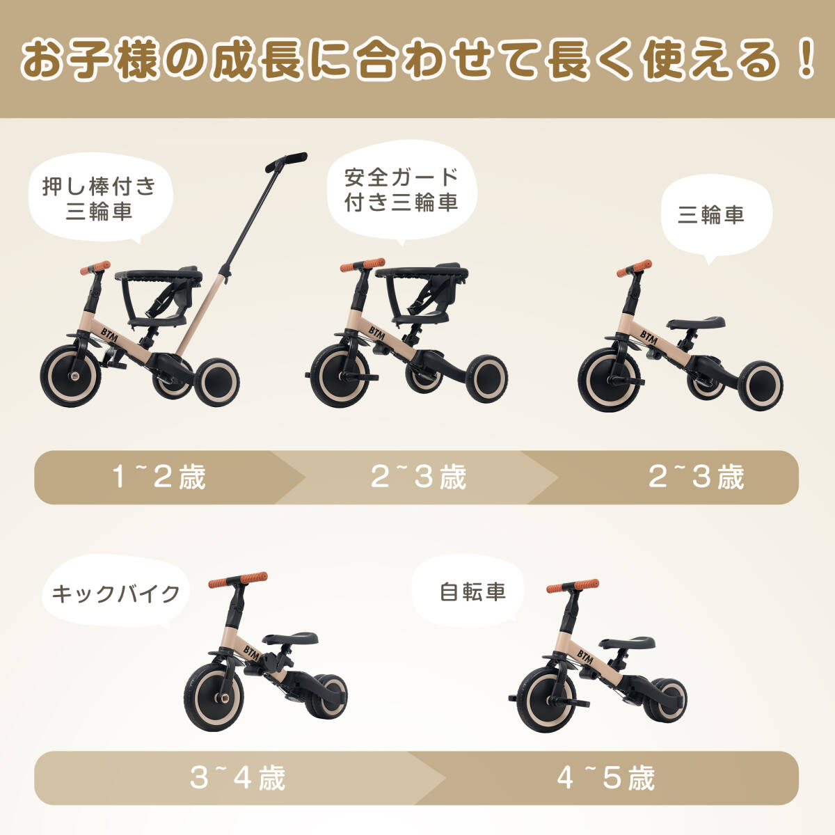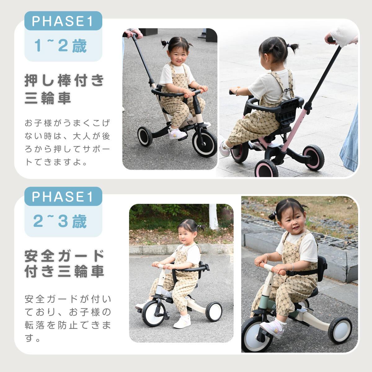 • 【一台4役】手押し三輪車モード、三輪車モード、ランニングバイクモード、自転車モード。様々な使い方があり、工具なしで組み合わせできです。お子様の成長に合わせて4階段でご使用いただけます。