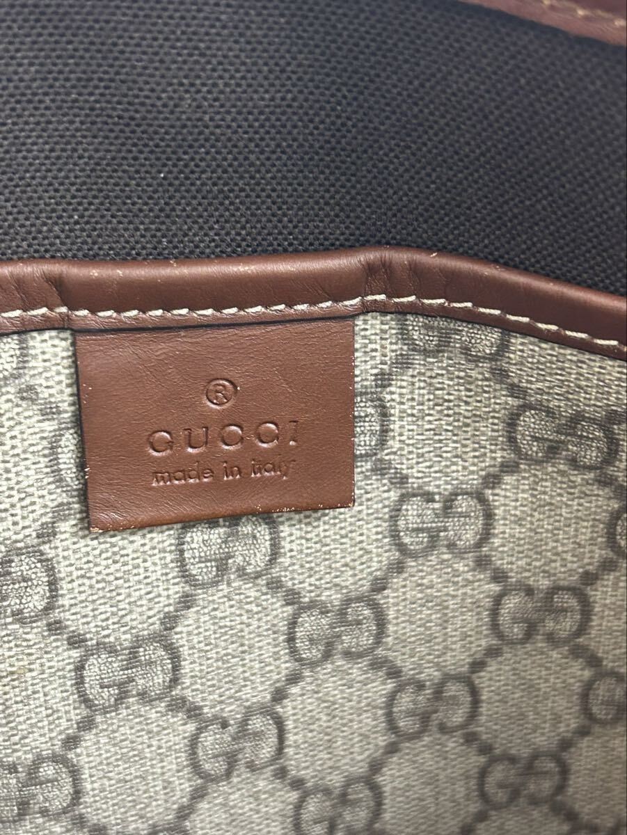 ブラウン系のキャンバス地にGG柄が施され、レザーのトリミングとシェリーライン(赤×緑)がアクセントになった上品なデザイン。通勤・通学・デイリー使いに最適なサイズ感で、ヴィンテージ感漂う希少な一点です。