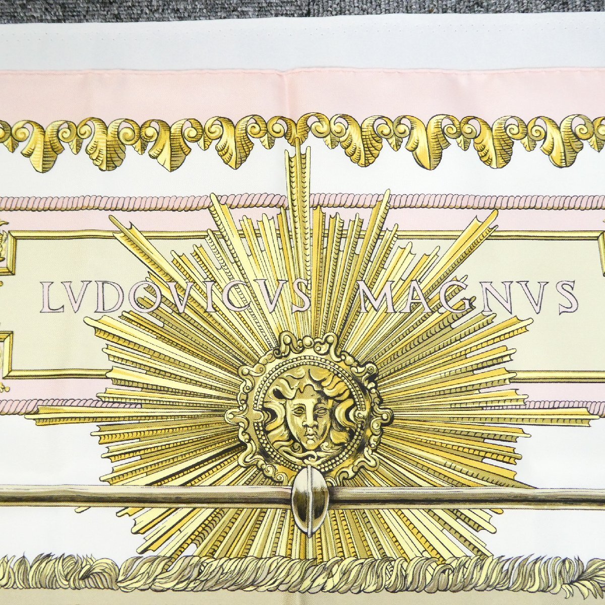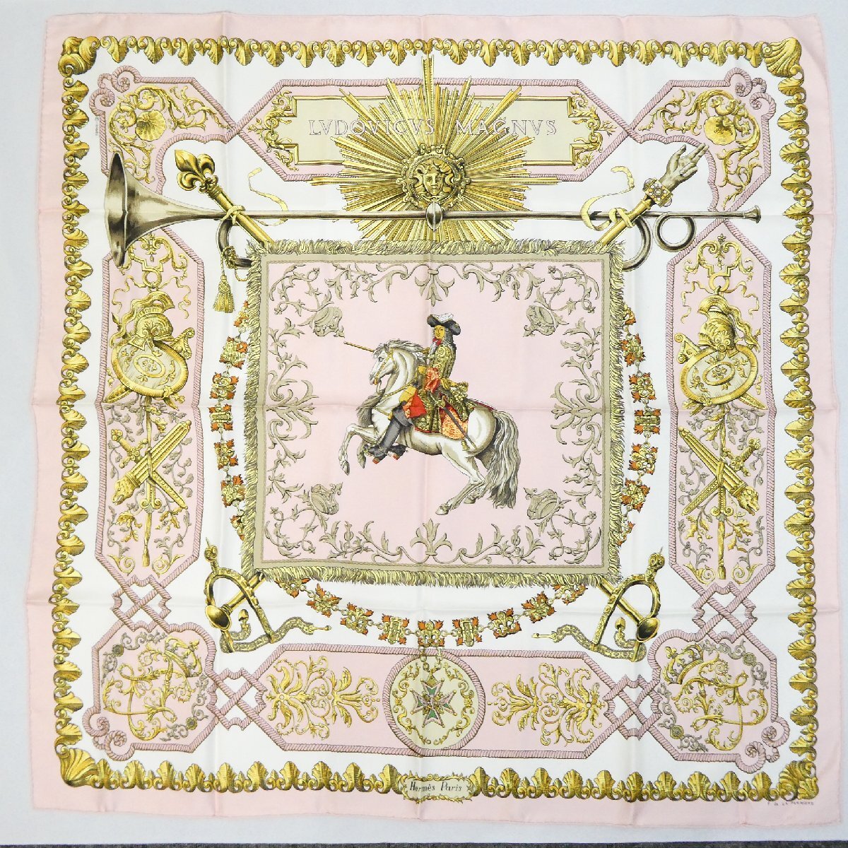 エルメス HERMES スカーフ カレ90 シルク LVDOVICVS MAGNVS 白い馬に跨ったルイ14世 大判 総柄 ピンク系 中古■RD057s■ |