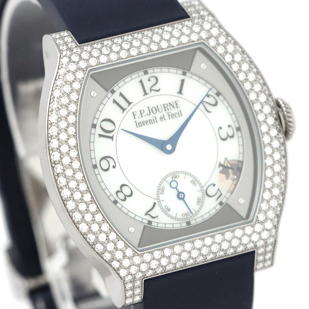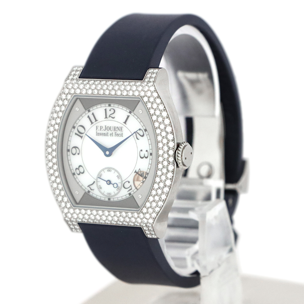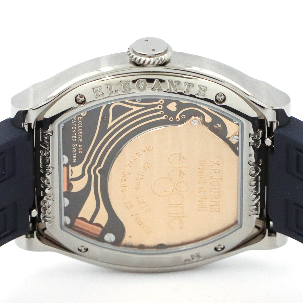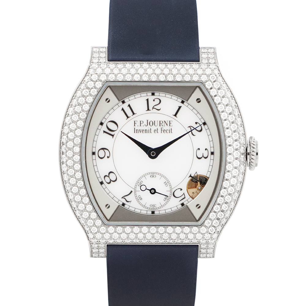 こちらはF.P.ジュルヌ エレガントです。開発に8年もの期間を要した革新的なムーブメント、エレクトロメカニカル・ムーブメントCal.1210を搭載し、高精度を実現するのはもちろんのこと、長期にわたって使用することができるよう設計された”エレガント”。このエレクトロメカニカル・ウォッチのコンセプトを表しているとも言える文字盤4時30分位置に見えるモーションディテクターにより、時間を正確に刻むだけでなく、一定時間使用しない場合には自動的に止まり、腕に着用すると再び動き始めます。腕から外し約30分後に止まると、スタンバイモードへと移行。その間マイクロプロセッサは時を刻み続けますが、歯車、ローター、針などの機械部品は電力を節約するために動きを止めます。時計を再び身に着けると、針は時計回りまたは反時計回りのいずれかに動いて自動的に現在の時刻を表示し動き出します。これにより毎日使用した場合でも約8~10年、スタンバイモードでは約18年と、長期に渡り使用可能な設計を実現します。優雅さと現代的な美しさをもつチタン素材のフラットトノーケースに、222個のブリリアントカットダイヤモンドが上品に彩る煌びやかなベゼル。審美性と追求された実用性を兼ね備えた、まさに真のラグジュアリーウォッチです。