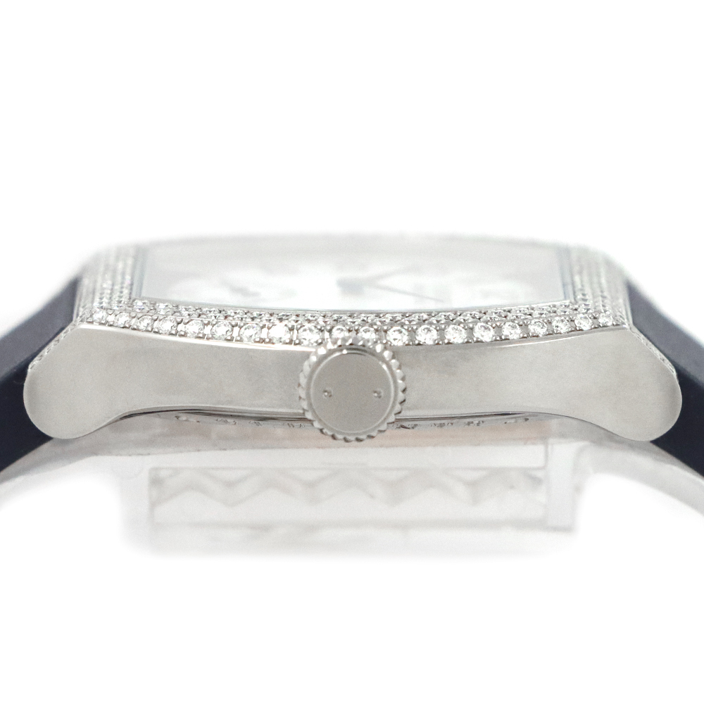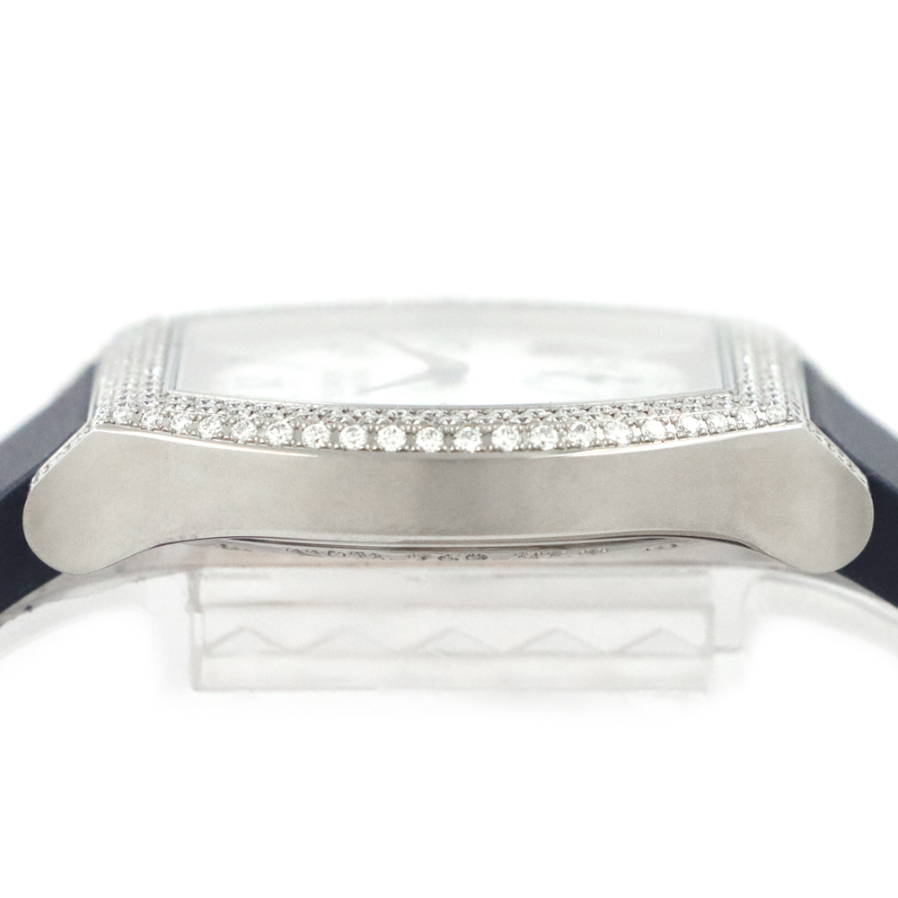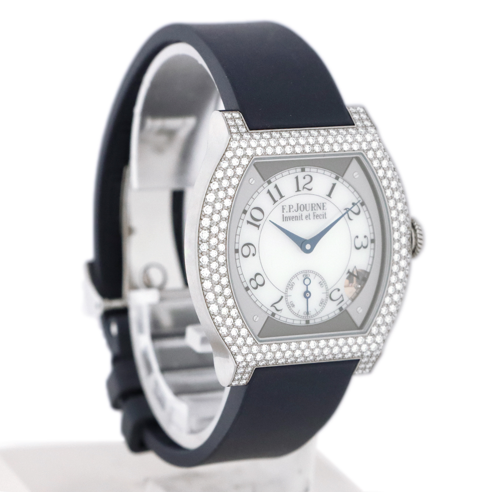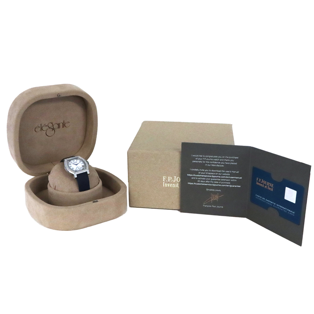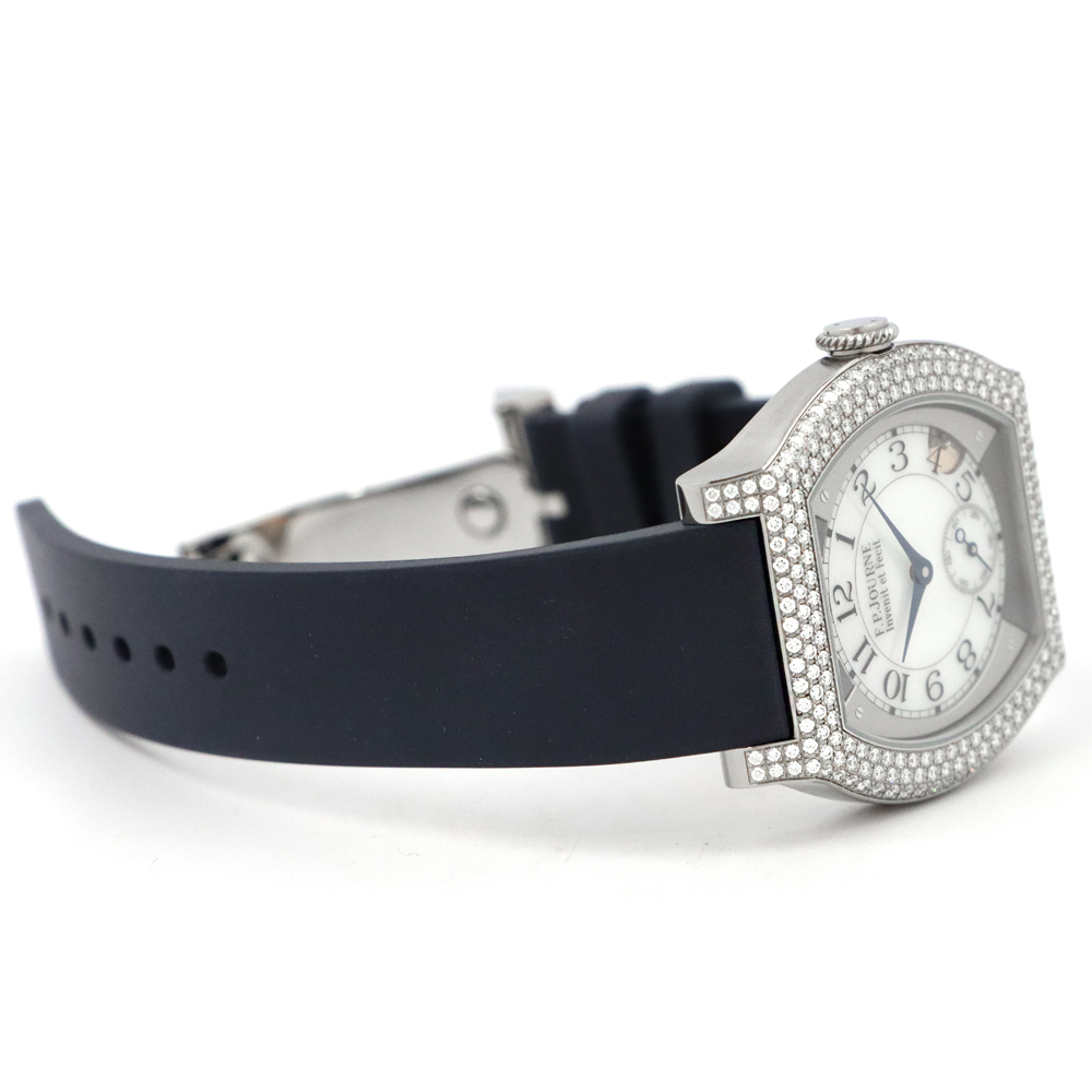 こちらはF.P.ジュルヌ エレガントです。開発に8年もの期間を要した革新的なムーブメント、エレクトロメカニカル・ムーブメントCal.1210を搭載し、高精度を実現するのはもちろんのこと、長期にわたって使用することができるよう設計された”エレガント”。このエレクトロメカニカル・ウォッチのコンセプトを表しているとも言える文字盤4時30分位置に見えるモーションディテクターにより、時間を正確に刻むだけでなく、一定時間使用しない場合には自動的に止まり、腕に着用すると再び動き始めます。腕から外し約30分後に止まると、スタンバイモードへと移行。その間マイクロプロセッサは時を刻み続けますが、歯車、ローター、針などの機械部品は電力を節約するために動きを止めます。時計を再び身に着けると、針は時計回りまたは反時計回りのいずれかに動いて自動的に現在の時刻を表示し動き出します。これにより毎日使用した場合でも約8~10年、スタンバイモードでは約18年と、長期に渡り使用可能な設計を実現します。優雅さと現代的な美しさをもつチタン素材のフラットトノーケースに、222個のブリリアントカットダイヤモンドが上品に彩る煌びやかなベゼル。審美性と追求された実用性を兼ね備えた、まさに真のラグジュアリーウォッチです。