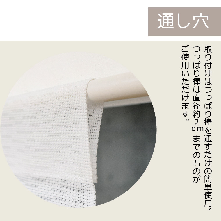 〇仕様 | ・のれん棒・突っ張り棒をご利用ください(棒は付属しません)。直径2cmまでのものがご使用いただけます。 |